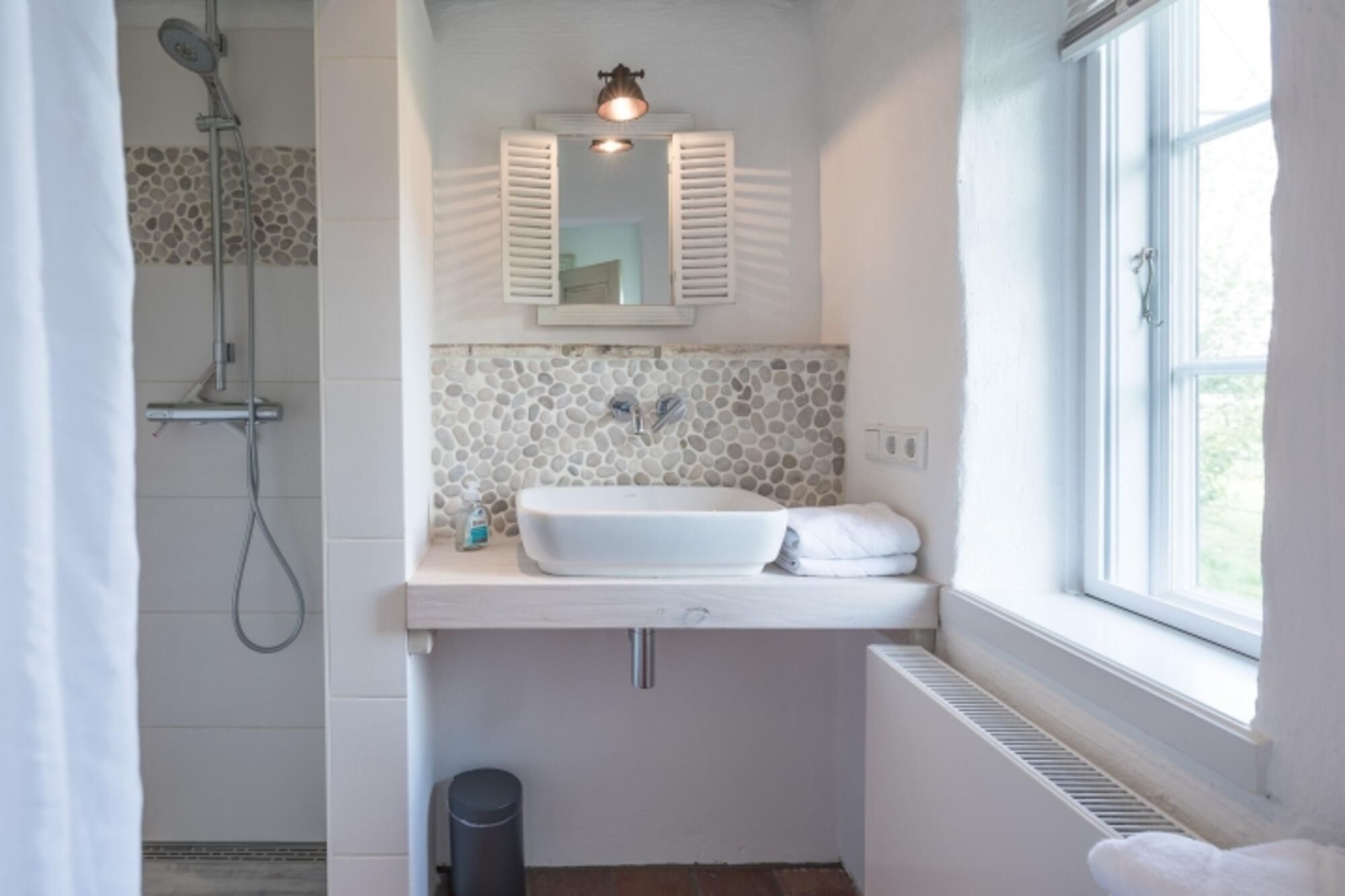 Waschbecken, Spiegel, Fenster im Bad