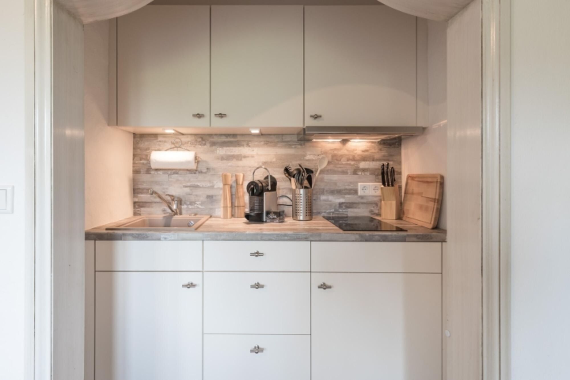 2-Platten Herd, Cerankochfeld, Dunstabzugshaube, Kühlschrank mit Gefrierfach, Mixer, Essplatz in der Küche
