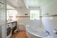 Das große Badezimmer ist mit einer Dusche, einer Badewanne mit Whirlpoolfunktion und einer Waschmaschine ausgestattet.