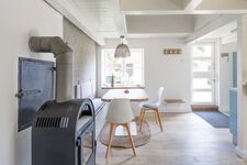 Das Ferienhaus ist im modernen friesischen Stil eingerichtet und begeistert durch seinen großen, offenen Wohnraum mit Sofaecke vor dem Kaminofen, Flachbild-TV (Sat), dem geselligen Essbereich und der offenen Küche mit Herd, Backofen, Kühlschrank, Geschirrspülmaschine, Kaffeemaschine (Filtergröße 4), Wasserkocher, Toaster, ausreichend Geschirr und Kochutensilien.