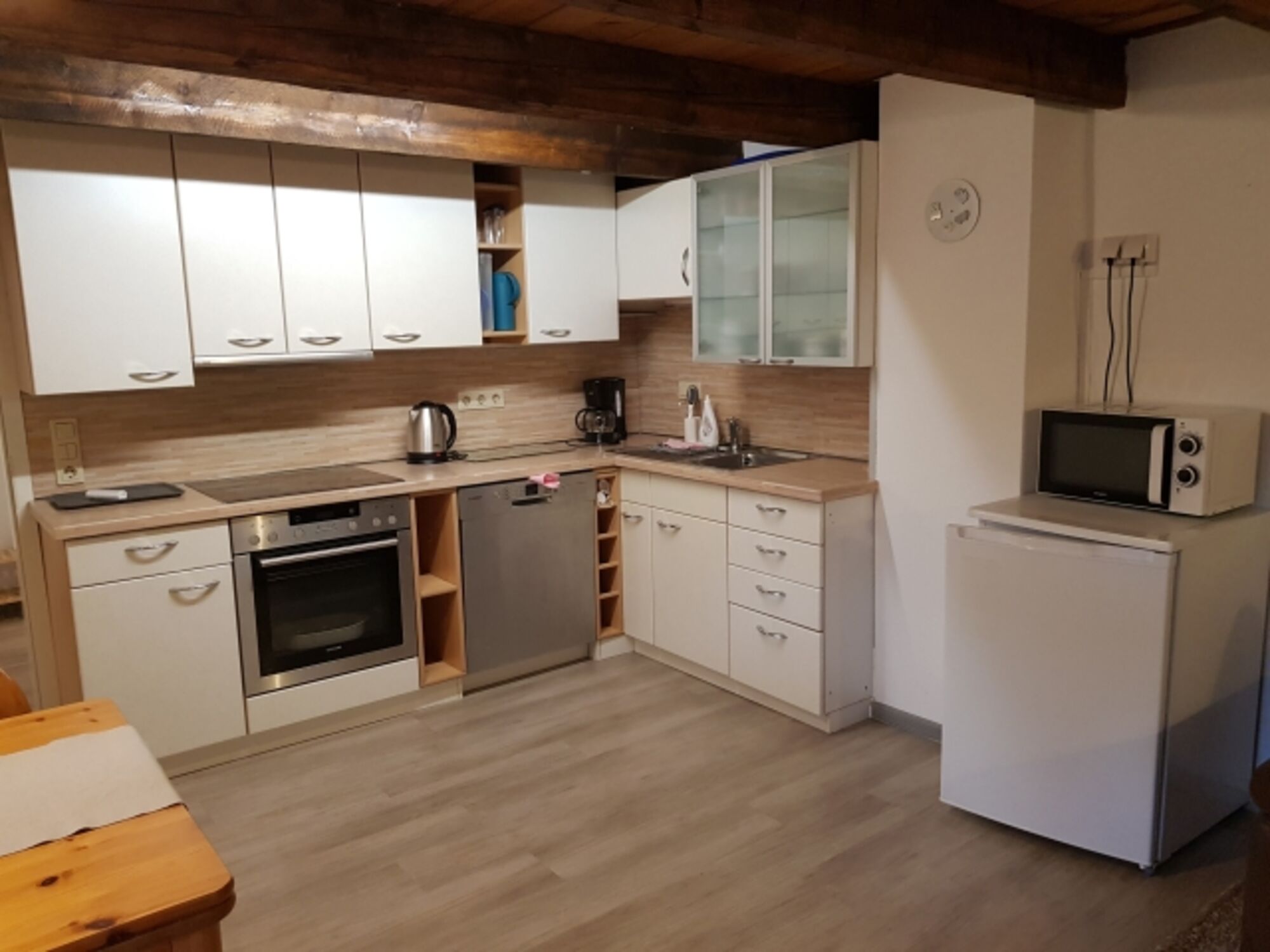 Cerankochfeld, Induktionsherd, Dunstabzugshaube, Kühlschrank mit Gefrierfach, Eierkocher, Mixer, Korkenzieher / Flaschenöffner, Gewürze (Salz, Pfeffer, Zucker), Geschirrhandtücher, Mülltüten, Essplatz in der Küche