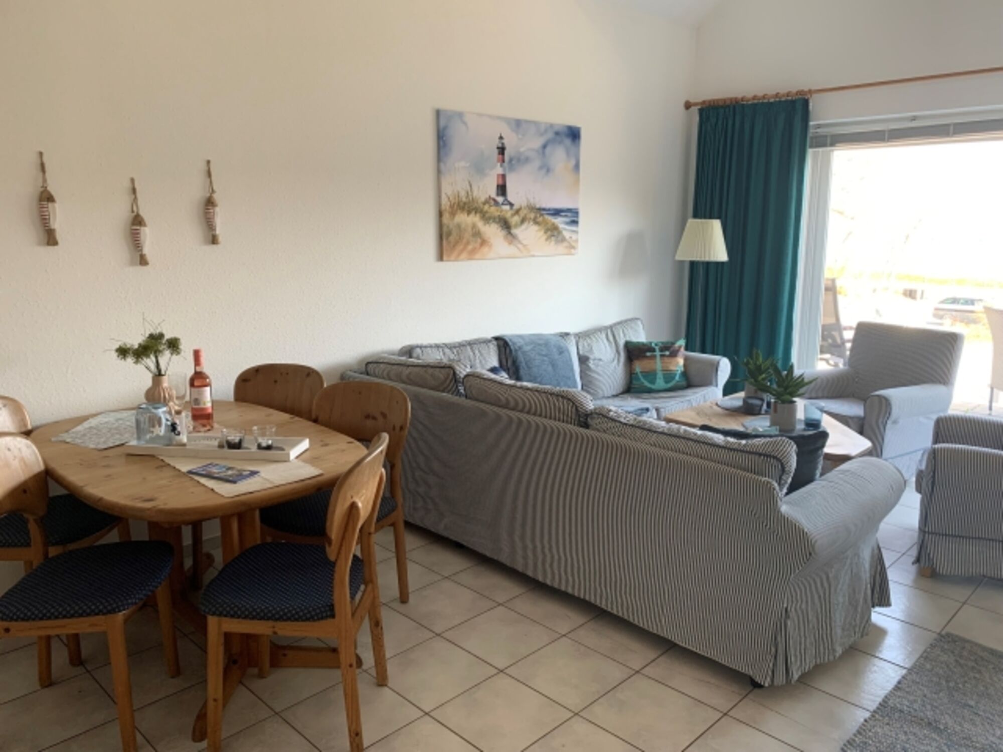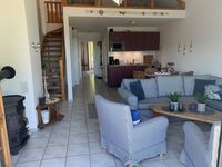 Der helle und sehr geräumige Wohnraum bietet einen großen Essbereich und gemütliche Sofaecke und zwei Sessel.