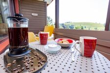 Der Balkon wurde mit modernen Nardi Möbel ausgestattet. Dazu gehört eine 2er Sitzbank, einen kleinen Tisch, ein Sitz, und ein Liegestuhl mit Fußbank. Der Ausblick ist herrlich.