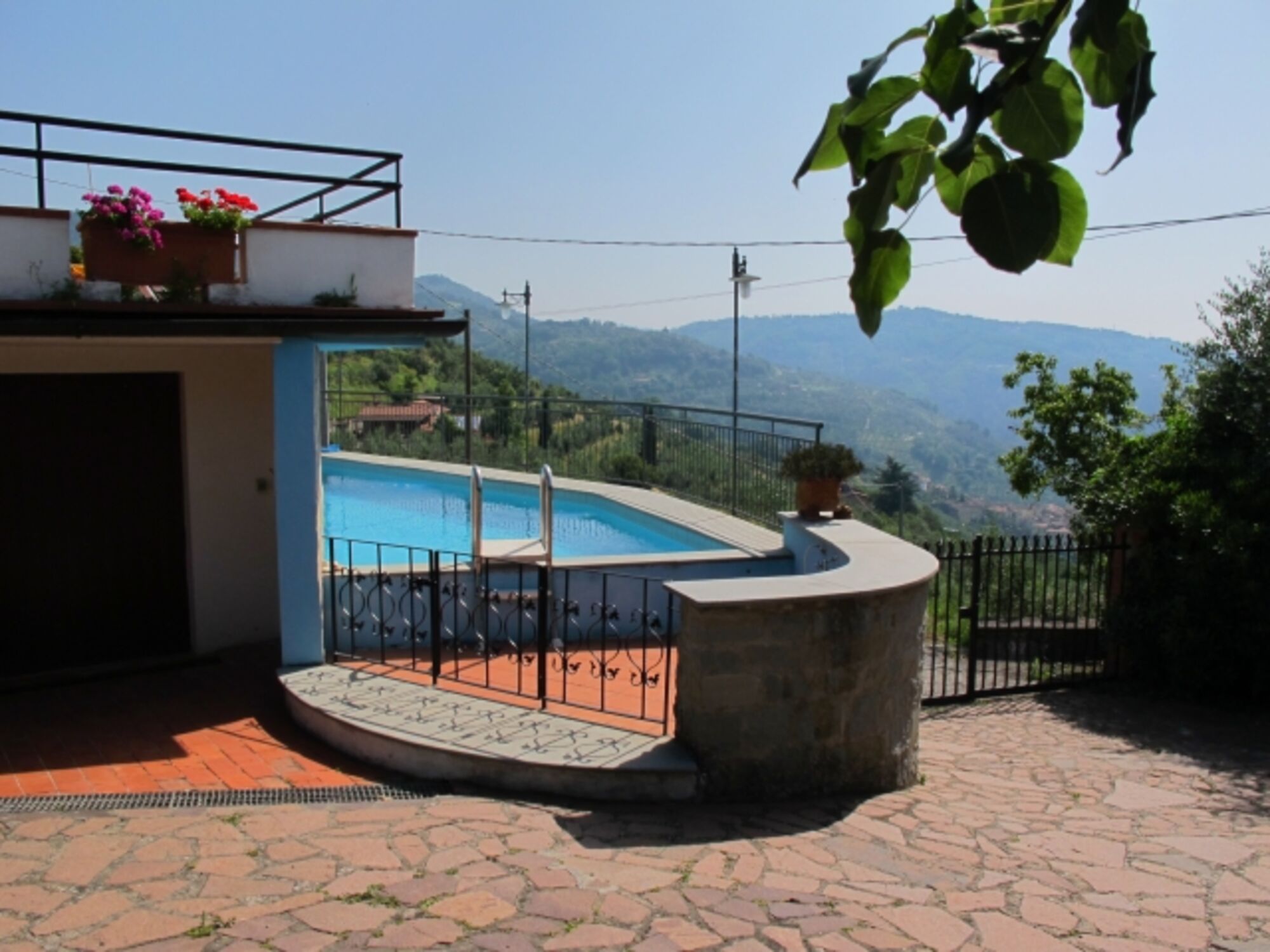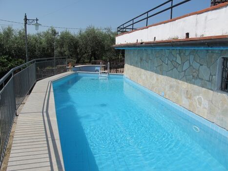 Der illuminierte Privat-Pool (Tiefe: 90 cm bis max. 1,60 m, 12 m lang, 4 bis 6 m breit) ist sehr bequem über 14 Stufen zu erreichen: er liegt direkt unterhalb der Panorama-Terrasse und ist an einer Haus-Seite angebaut. Der Pool ist von Anfang Mai bis Ende September geöffnet.