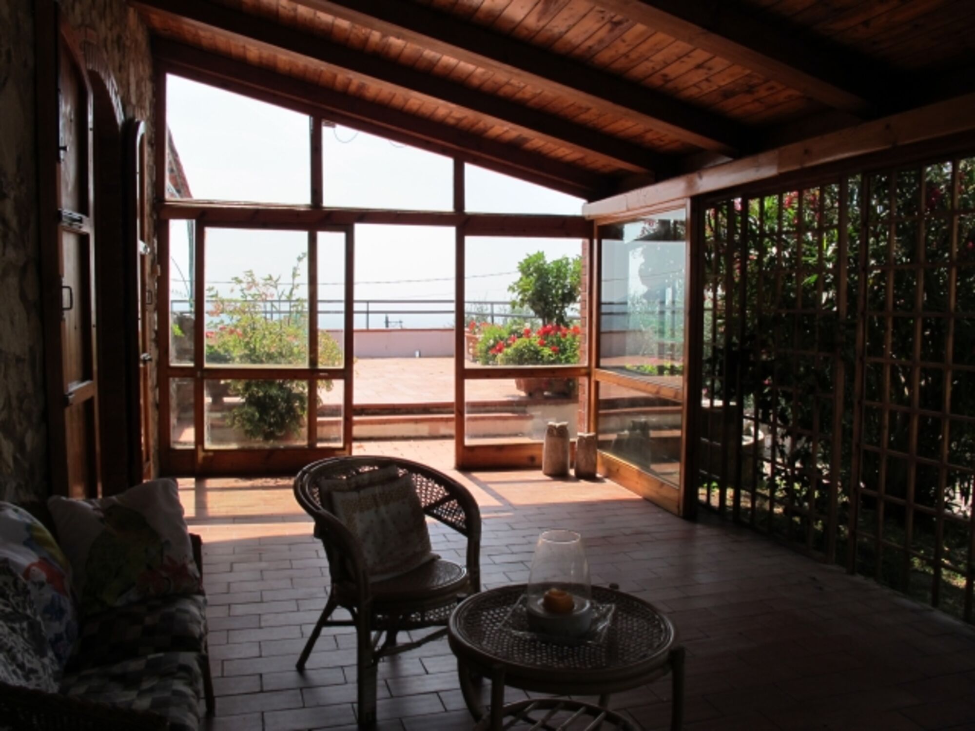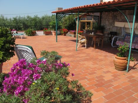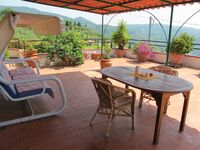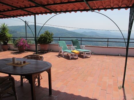 Zugang zur teilweise überdachten, ca. 100 qm großen Panorama-Terrasse mit Barbecue haben Sie u. a. direkt vom Wintergarten aus: Die Aussicht ist einfach spektakulär: Von hier blicken Sie auf das gesamte Tal Valdinievole mit den antiken Hügeldörfern Massa, Cozzile, Montecatini Alto, Monsummano Alto, Montecatini Terme, bis hin in die Moorebene (Padule) und den Montalbano, der ehemaligen Jagdreviere der Medici. Besonders reizvoll und beeindruckend ist der Ausblick bei Nacht, wenn alles in einem "Meer von tausend kleinen Lichtern" erstrahlt.