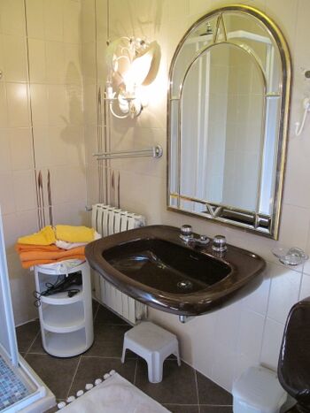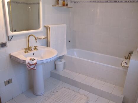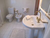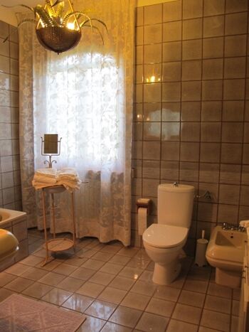 Waschbecken, Spiegel, Fenster im Bad, Bidet, Fliegengitter