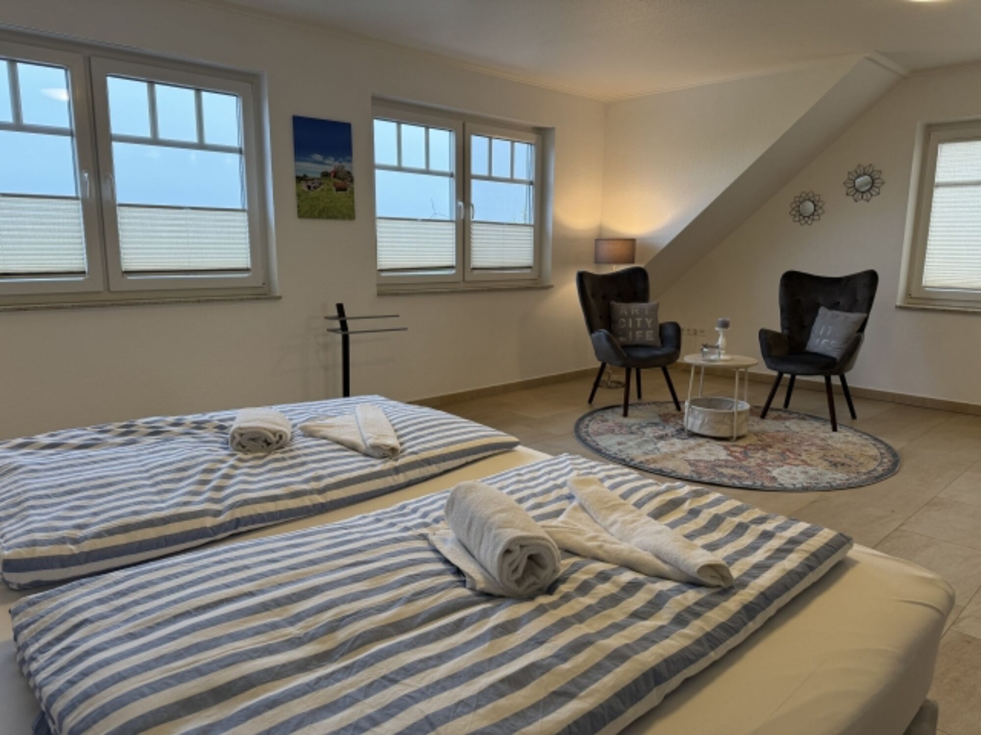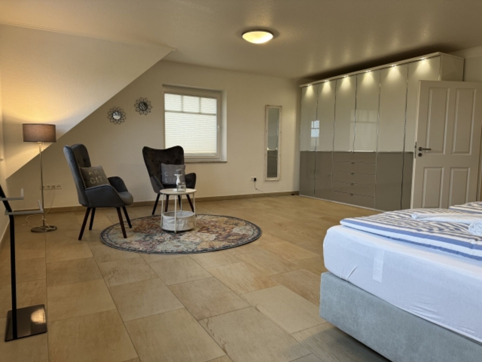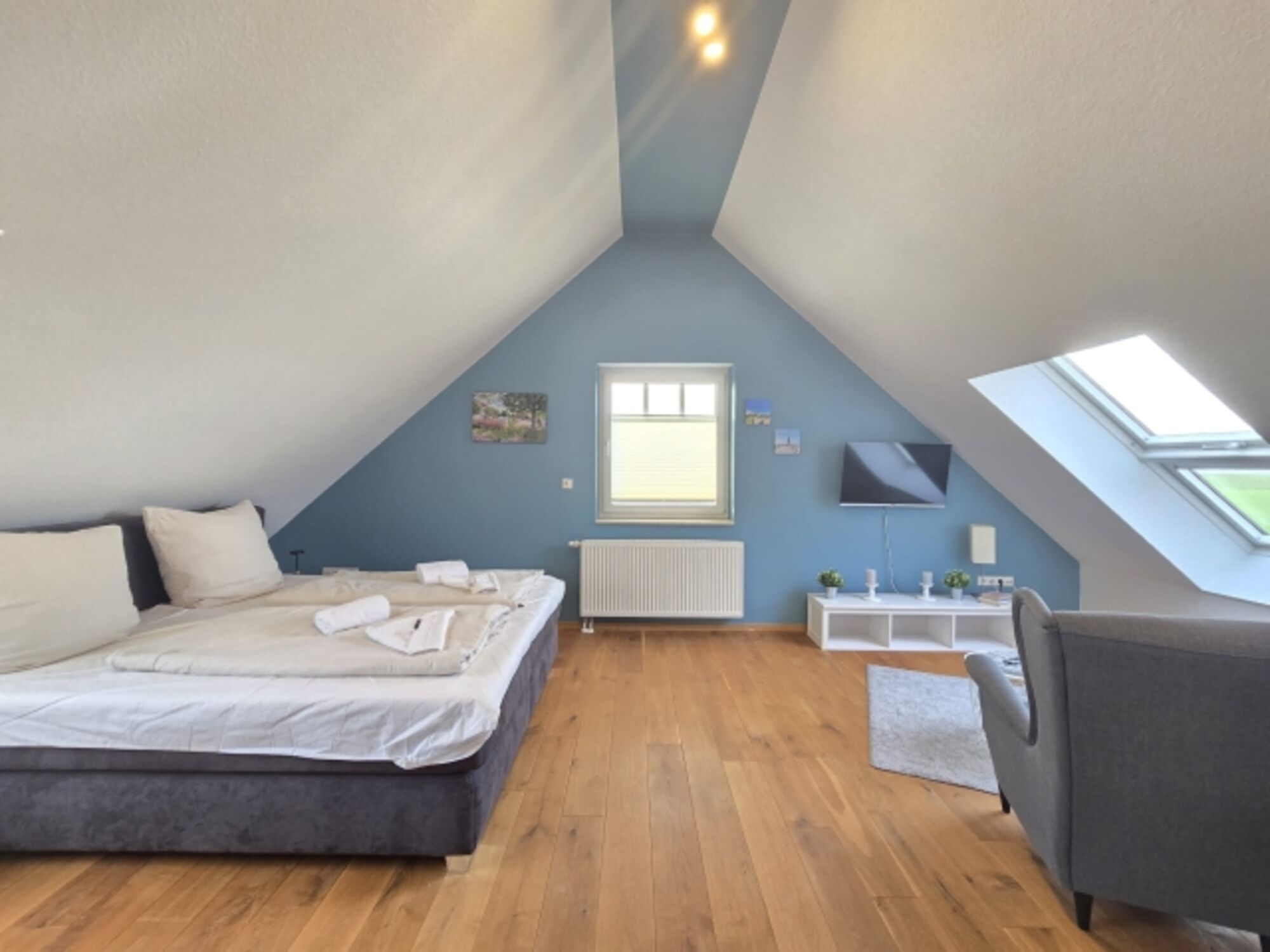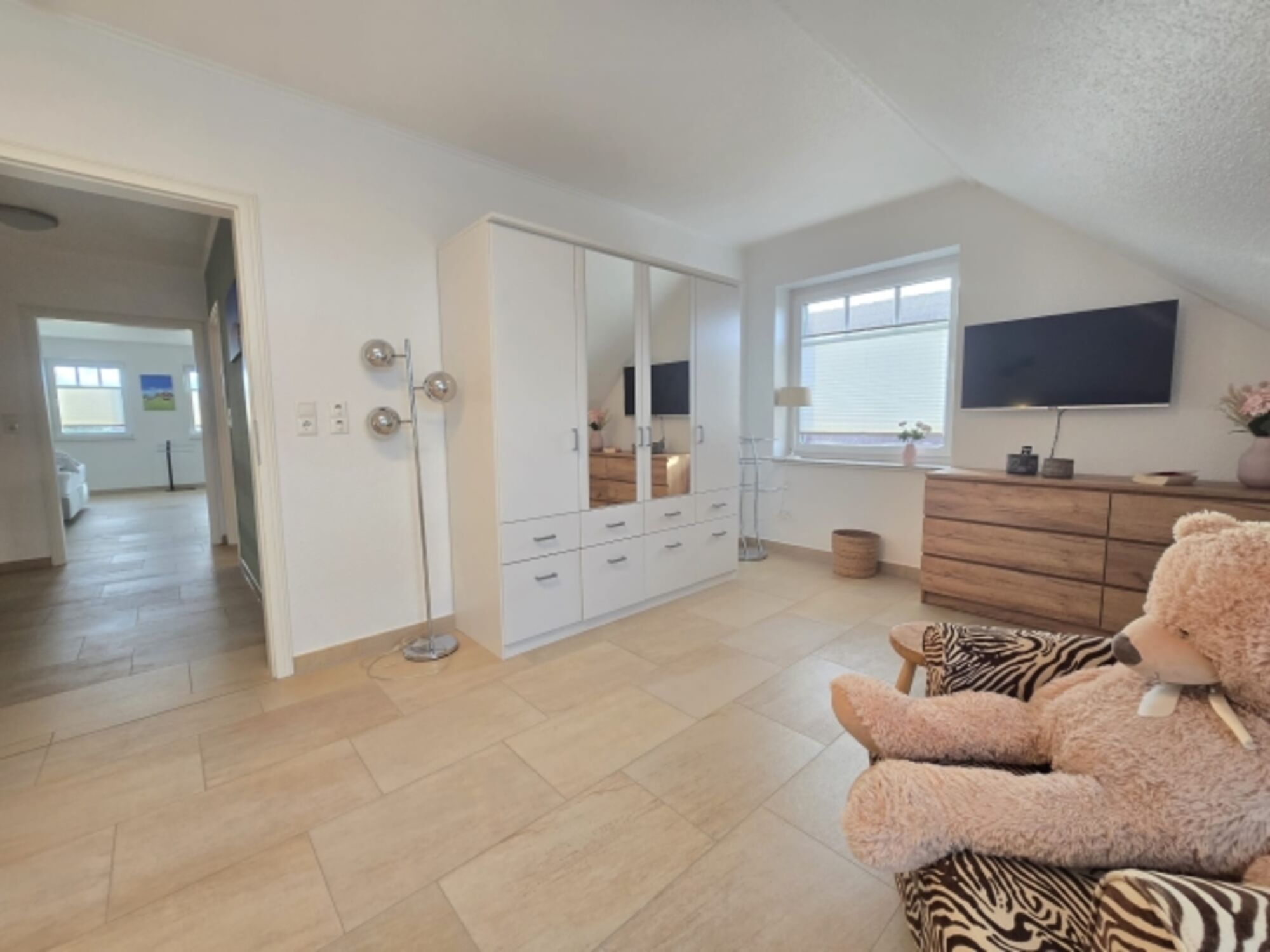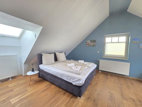 Alle Schlafzimmer verfügen über ein Boxspringbett mit TV und Kleiderschrank.