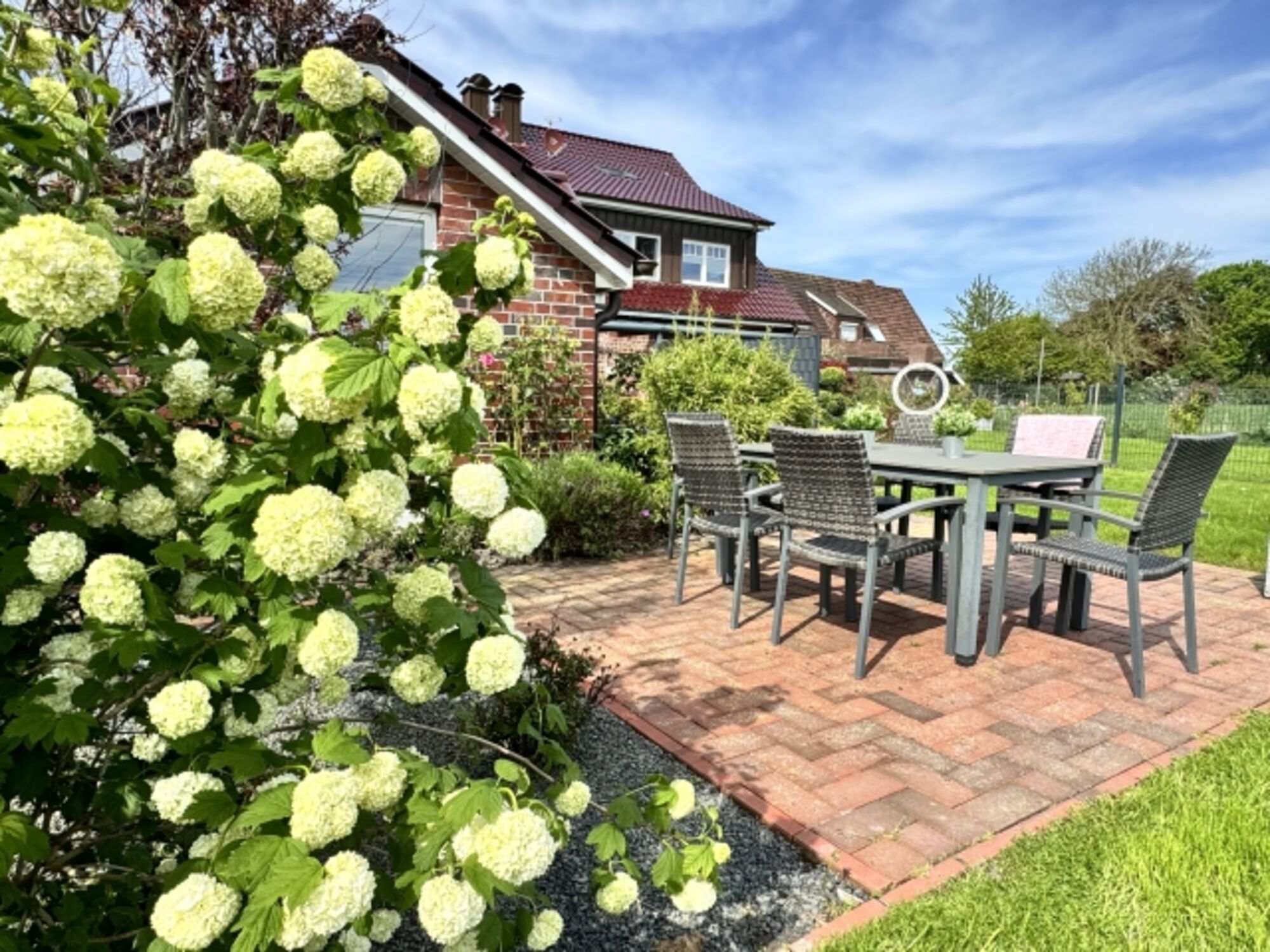 Hinter dem Gartenhaus befindet sich eine weitere Terrasse, an der Sie sich wunderbar mit einem Buch zurückziehen können.