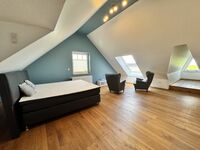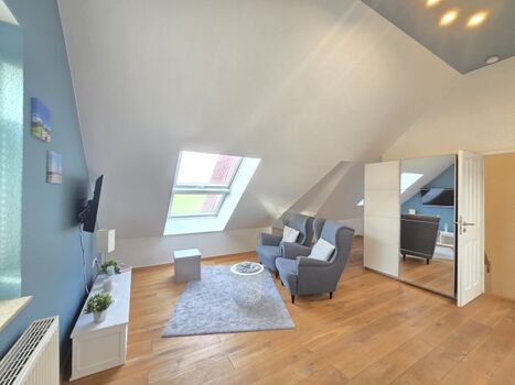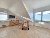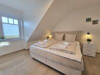 Im Obergeschoss finden Sie ein atemberaubendes Elternschlafzimmer mit einem herrlichen Ausblick, ein schickes Badezimmer mit Wanne u. Dusche sowie einen geräumigen Kinder/Gastbereich. Über eine schöne Treppe gelangen Sie in den aufwendig ausgebauten Spitzboden mit Parkettboden. Hier erwarten Sie weitere ca. 30 m² Nutzfläche mit Meerblick.