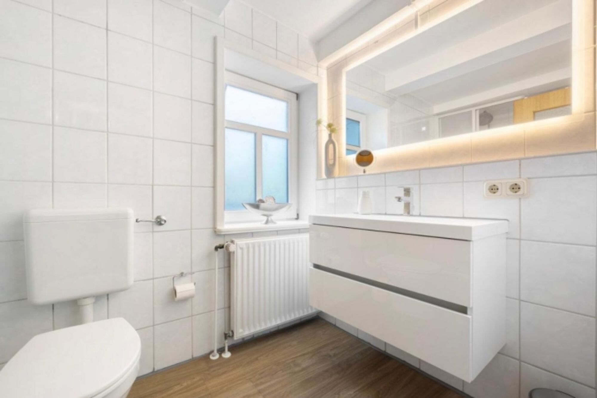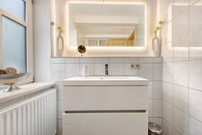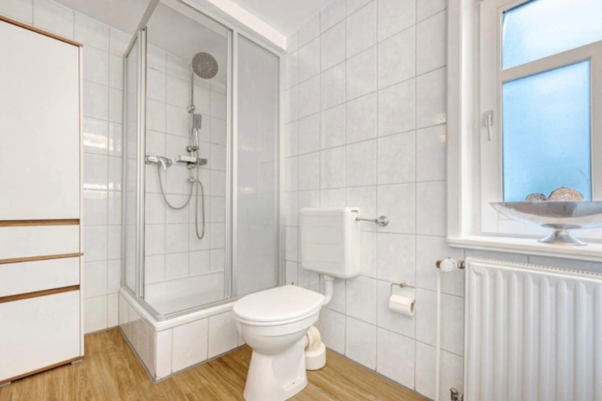 Willkommen in unserem funktionalen Tageslicht - Badezimmer, einem Ort der Erfrischung und Entspannung. Dieses gut durchdachte Badezimmer wurde so gestaltet, dass es nicht nur ästhetisch ansprechend ist, sondern auch Komfort und Funktionalität bietet. Hier können Sie bei einer erfrischenden Dusche neue Energie für den Tag tanken. Waschbecken, Spiegel, Fenster im Bad