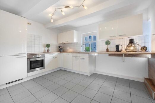 4-Platten Herd, Cerankochfeld, Kühlschrank mit Gefrierfach, Gefrierschrank, Gewürze (Salz, Pfeffer, Zucker), Geschirrhandtücher