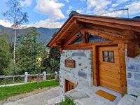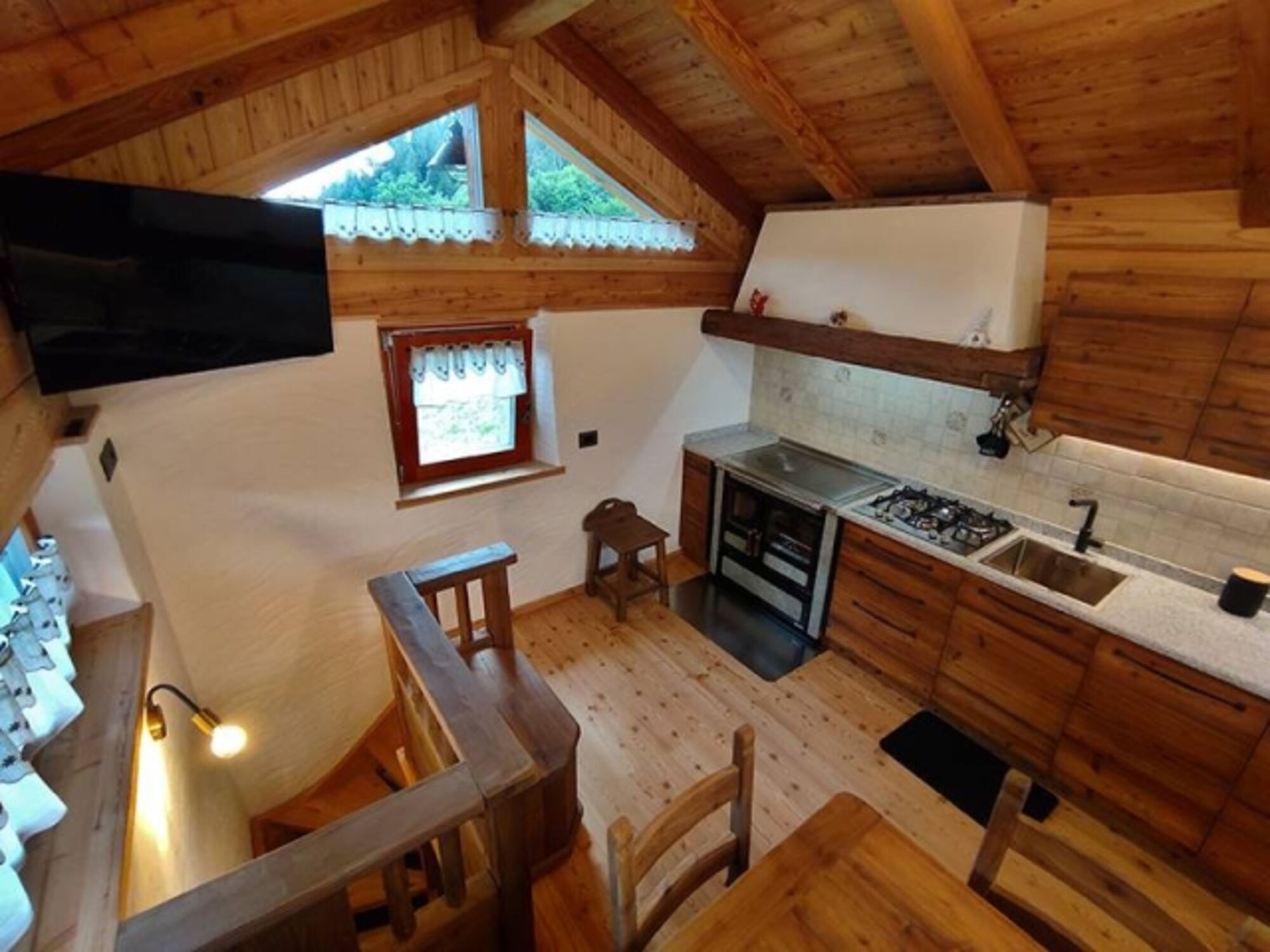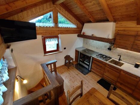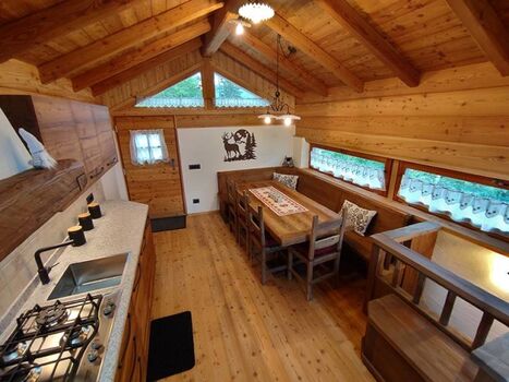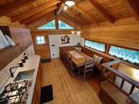 Das insgesamt ca. 50 m2 große Chalet erstreckt sich über zwei Ebenen und bietet Platz für bis zu 4 Personen. Der Haupteingang führt zum Wohnbereich (in dem Holz als Haupteinrichtungs- und Baumaterial dominiert), wo sich ein großer Tisch und die Küche mit Gasherd, Kühlschrank, Geschirrspüler und dem typischen Holzofen befinden.