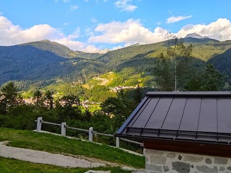 Eingebettet in das Grün der umliegenden Wiesen und Wälder bietet die Hütte einen herrlichen Blick auf Pinzolo, das obere Val Rendena und die Brenta-Berge.
