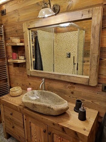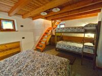 Wenn Sie über eine rustikale Holztreppe in die darunter liegende Ebene hinuntergehen, gelangen Sie in den geschmackvoll eingerichteten Schlafbereich, in dem antikes Massivholz für die Möbel und Bezüge sowie Granit für den Bodenbelag zur Geltung kommen. Den Gästen steht in der Hütte ein Doppelbett und ein typisches Etagenbett aus Massivholz zur Verfügung. Vom Schlafbereich aus hat man Zugang zu einem großen Badezimmer und einem Abstellraum.