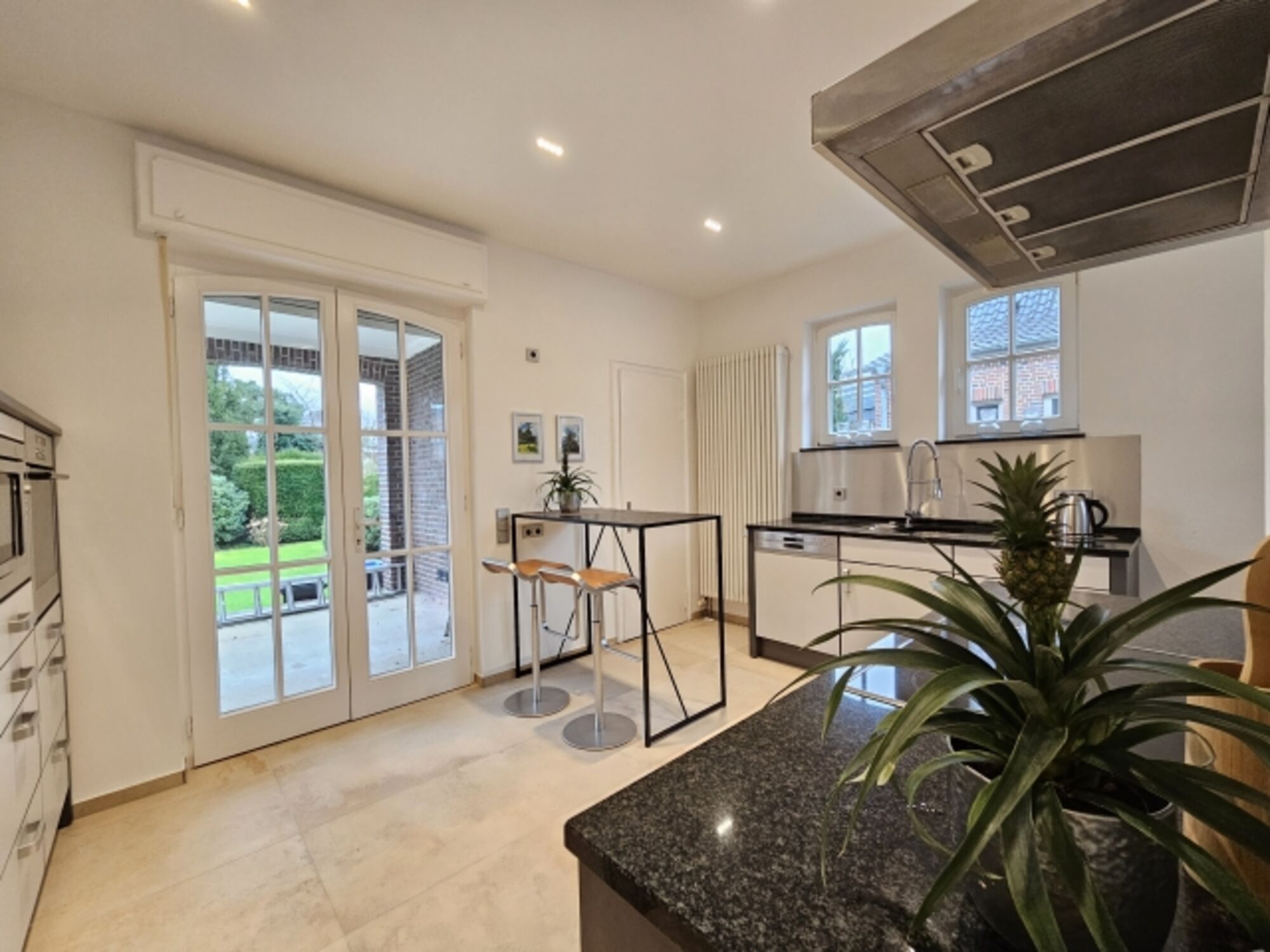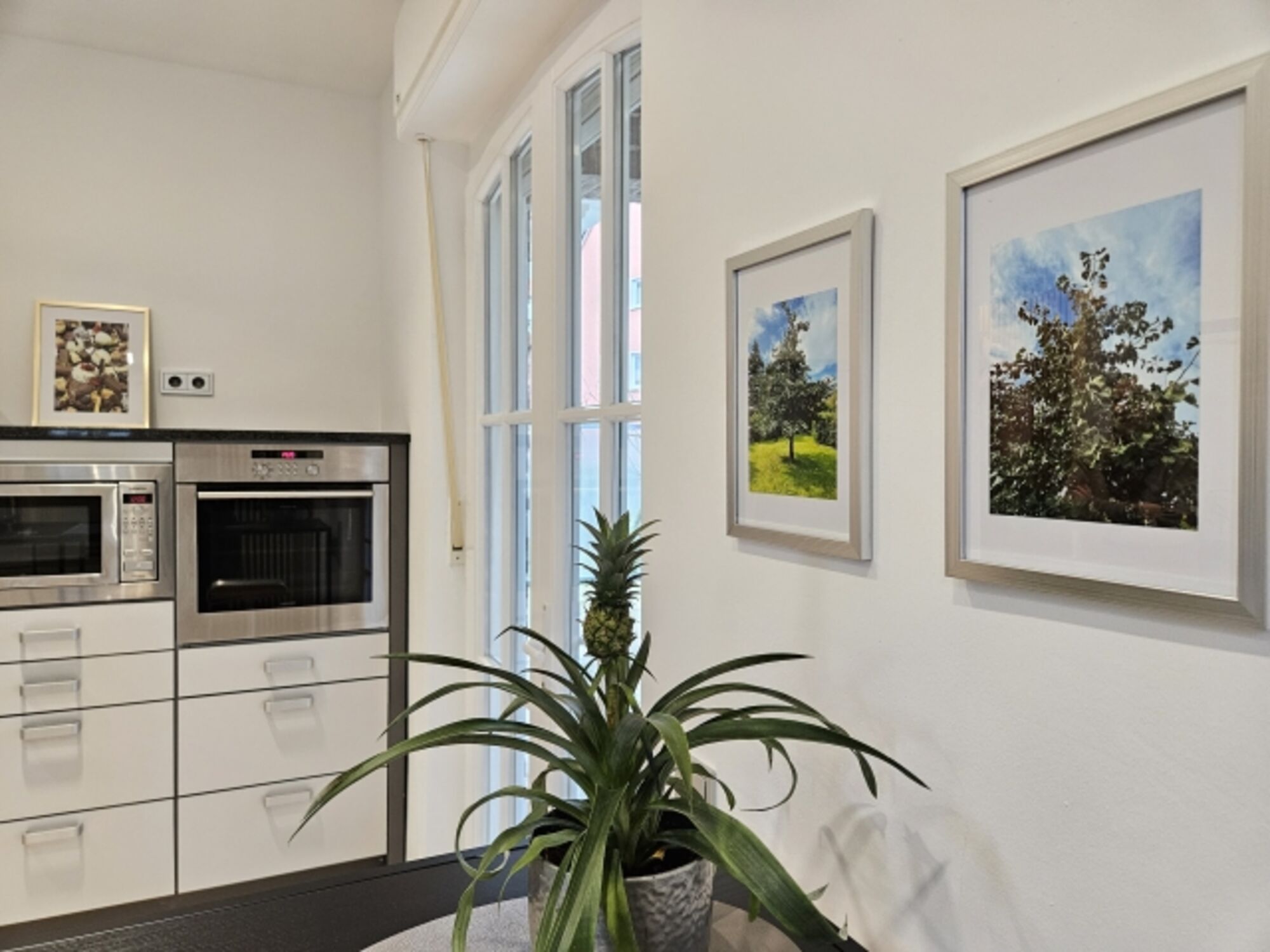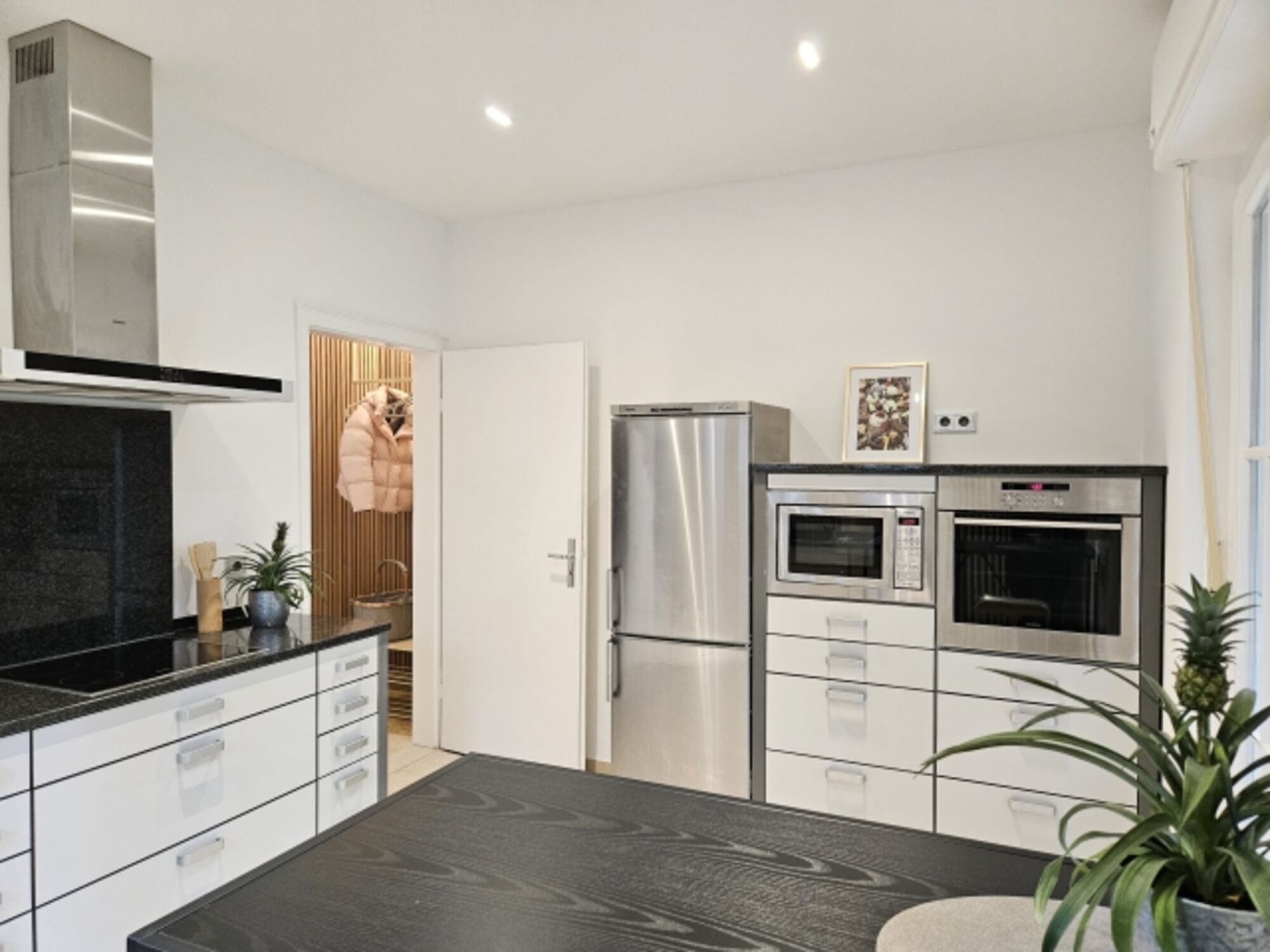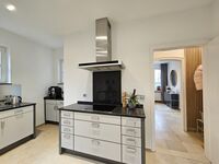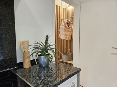 Cerankochfeld, Dunstabzugshaube, Kühlschrank mit Gefrierfach, Kaffeevollautomat, Gewürze (Salz, Pfeffer, Zucker), Mülltüten, Essplatz in der Küche