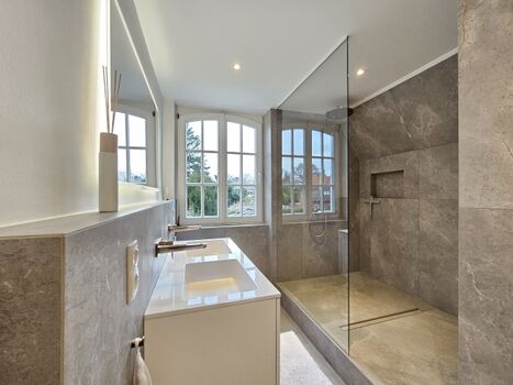 Doppelwaschbecken, Regendusche, Spiegel, Fenster im Bad