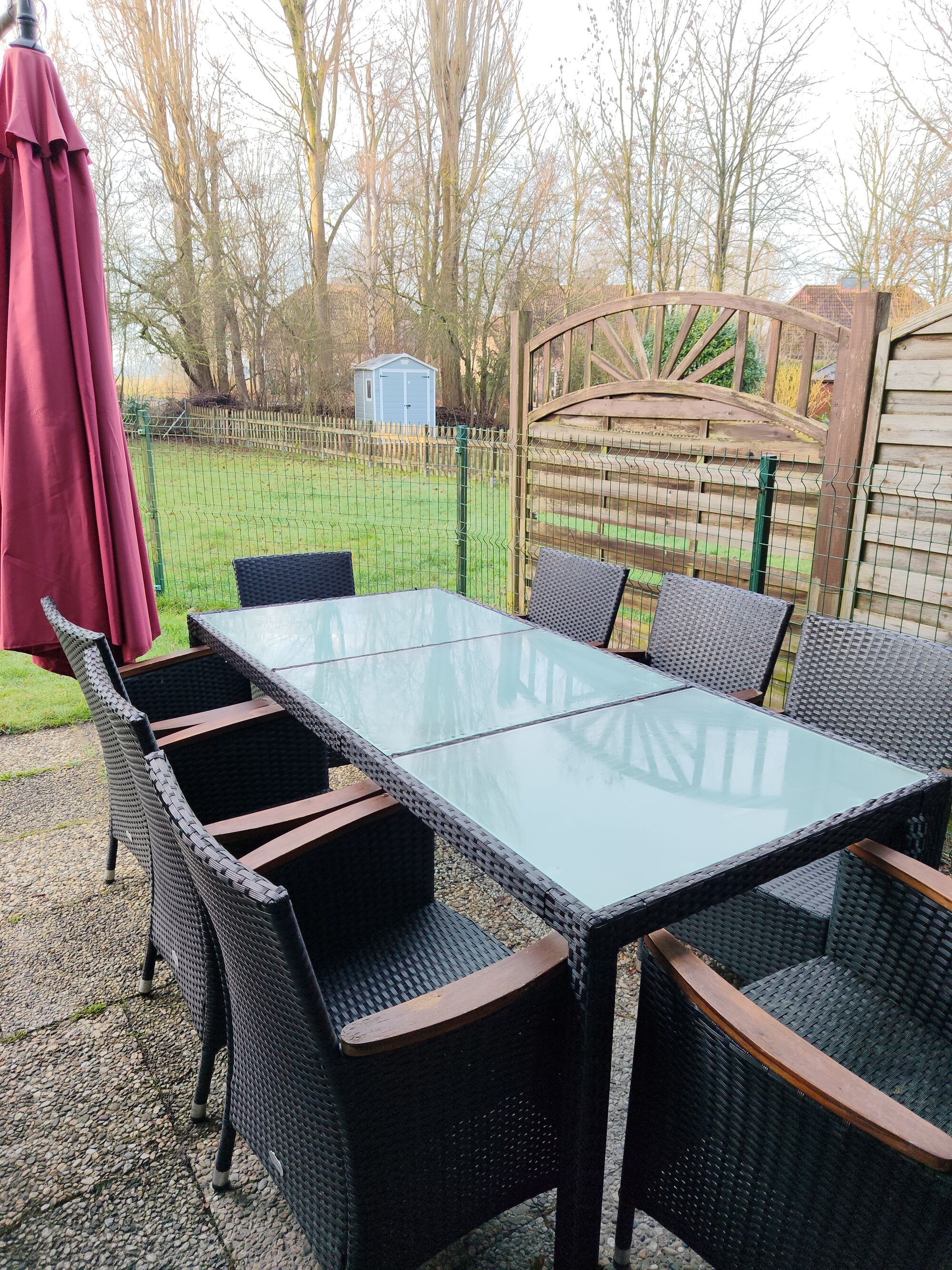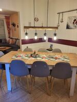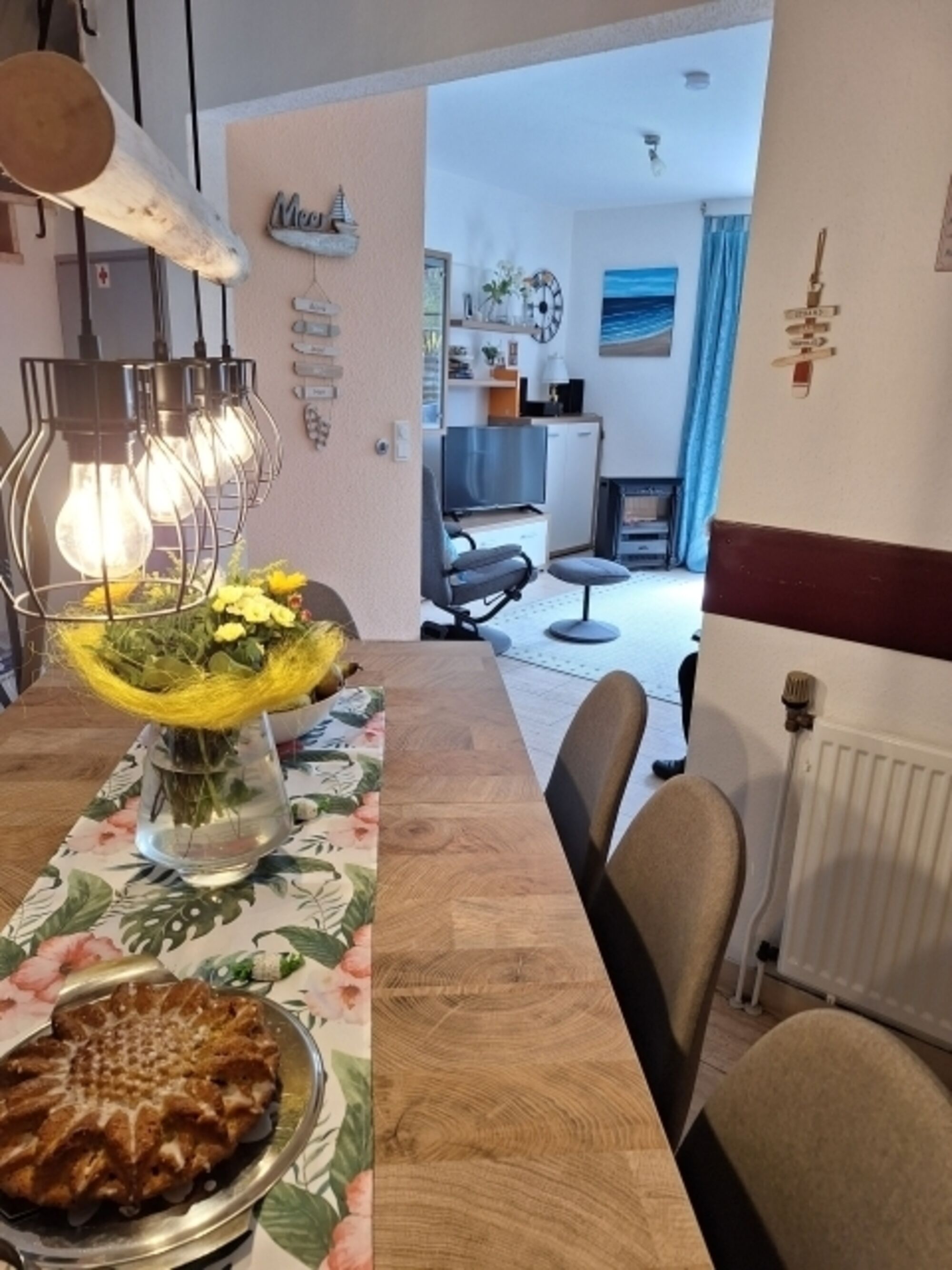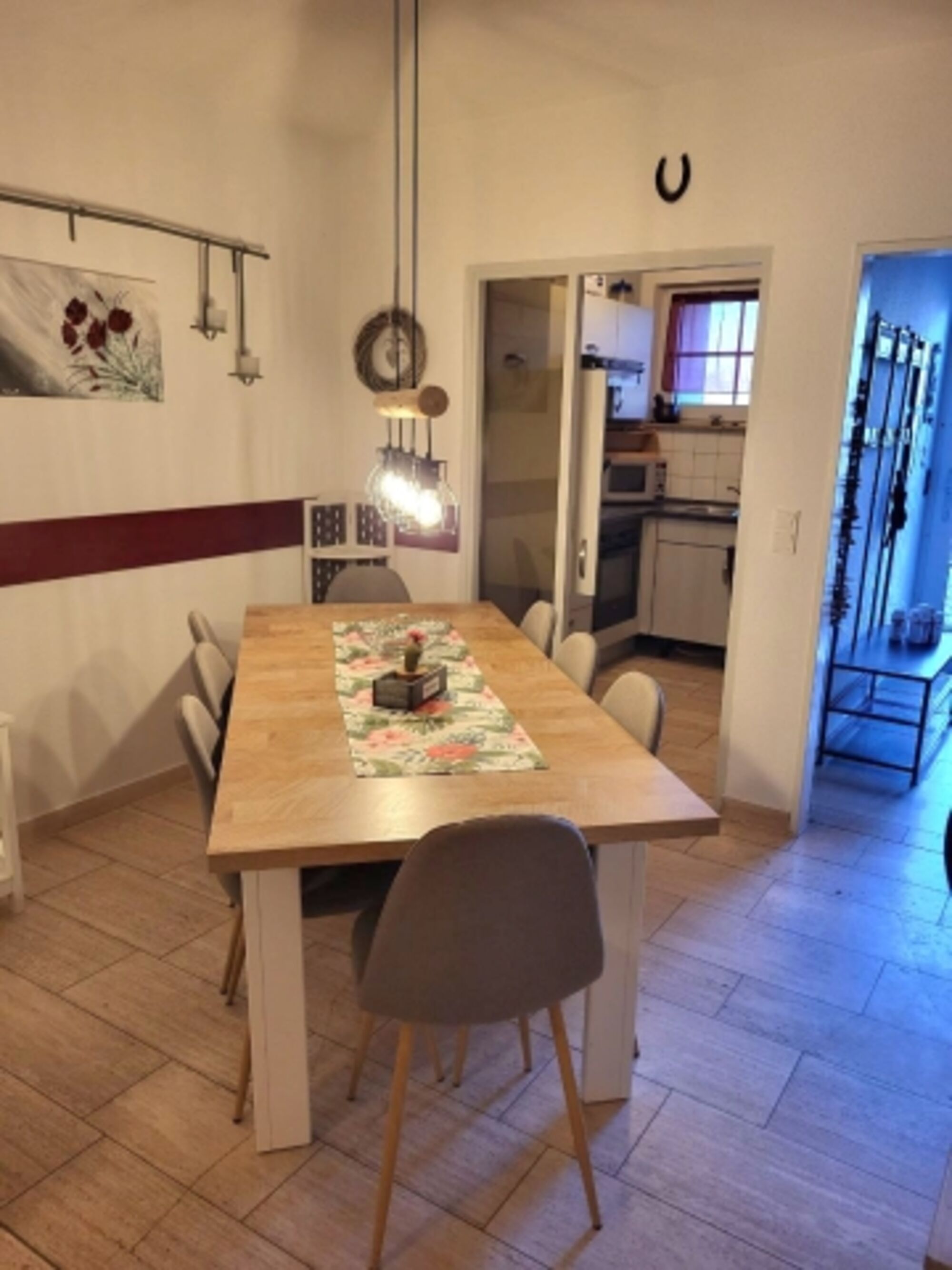 Das offene Wohn- und Esszimmer wird durch 1 Glastür von der Küche getrennt. Es steht 1 Holztisch mit 8 Stühlen + 2 Hochstühle bereit.