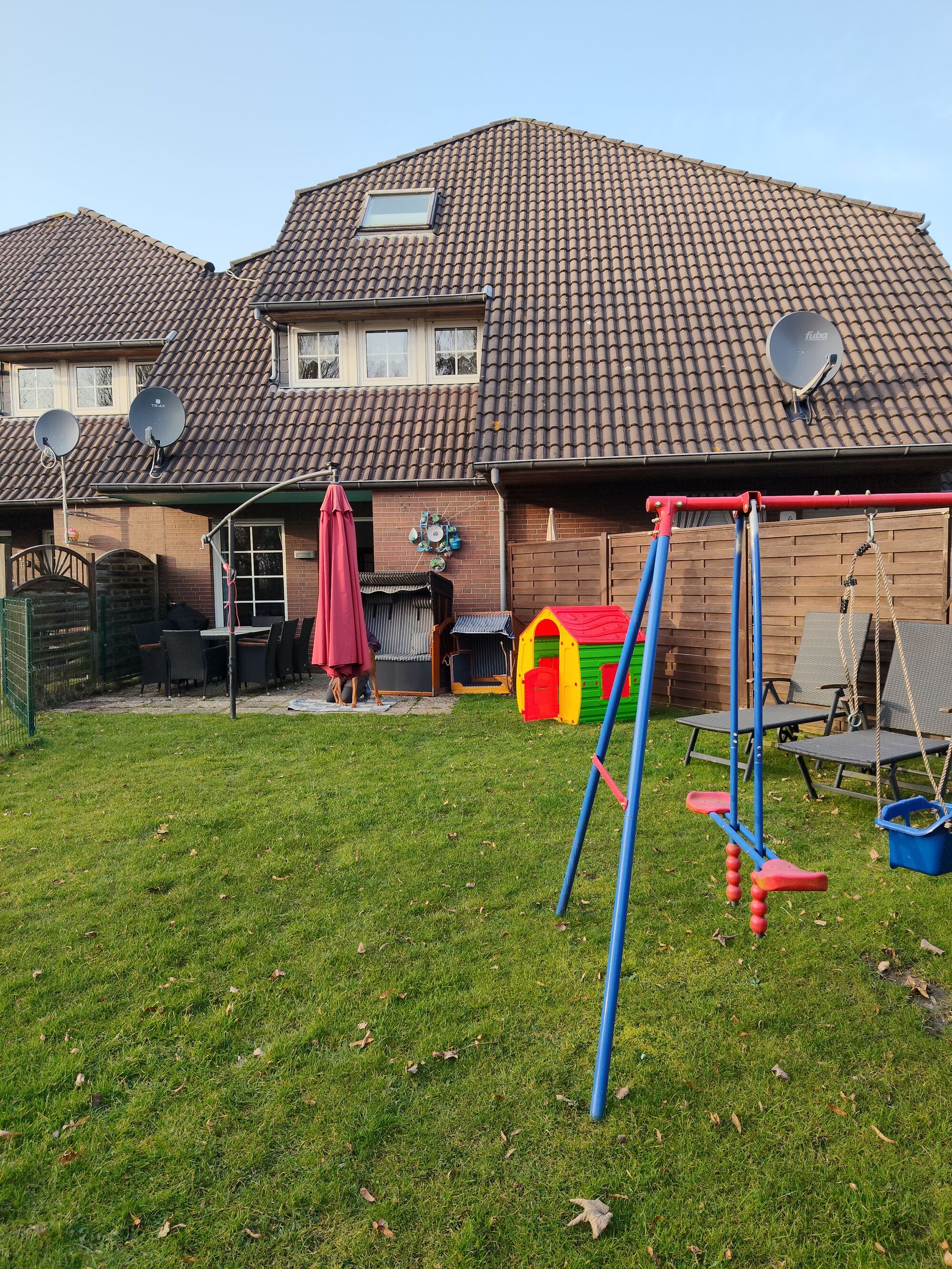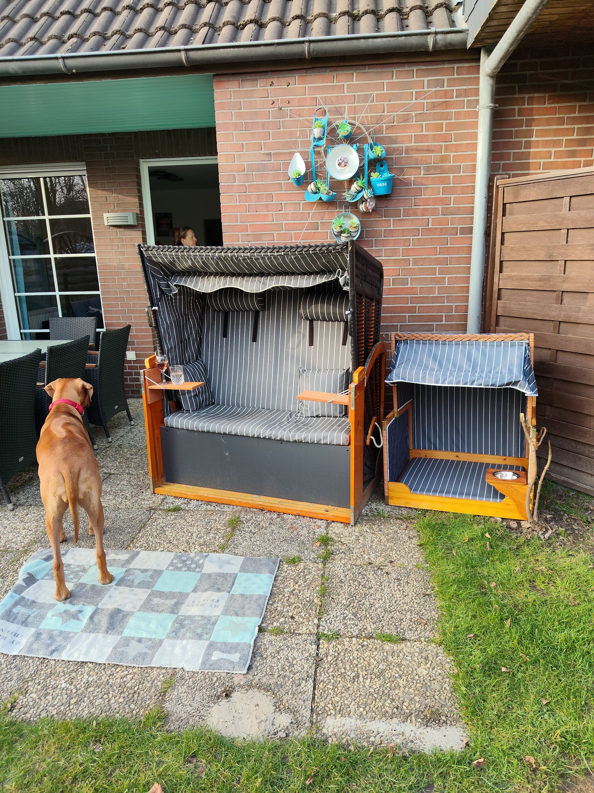 Im eingezäunten Garten sind Kinderspielgeräte Strandkorb und Hundestrandkorb vorhanden.