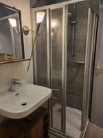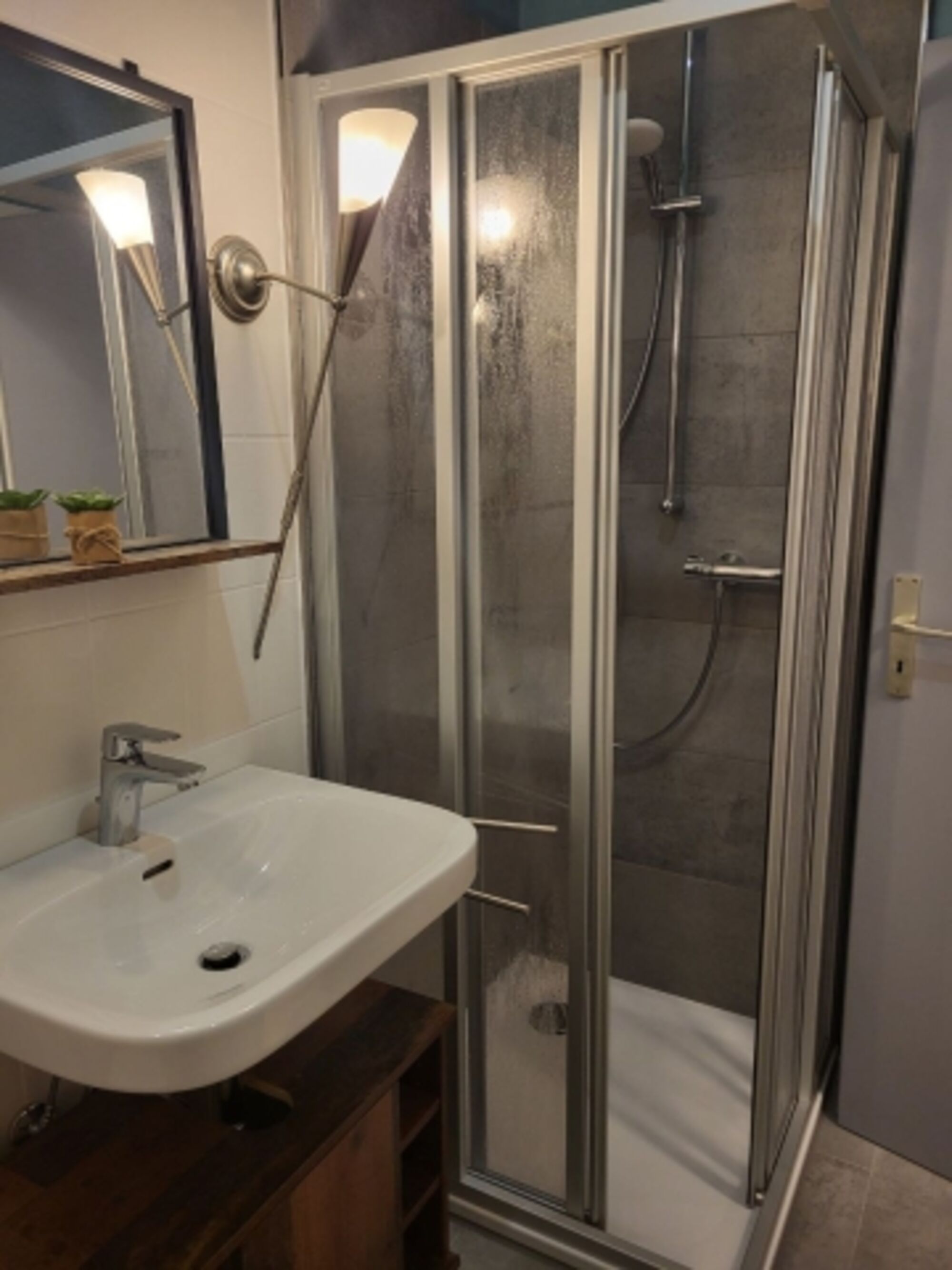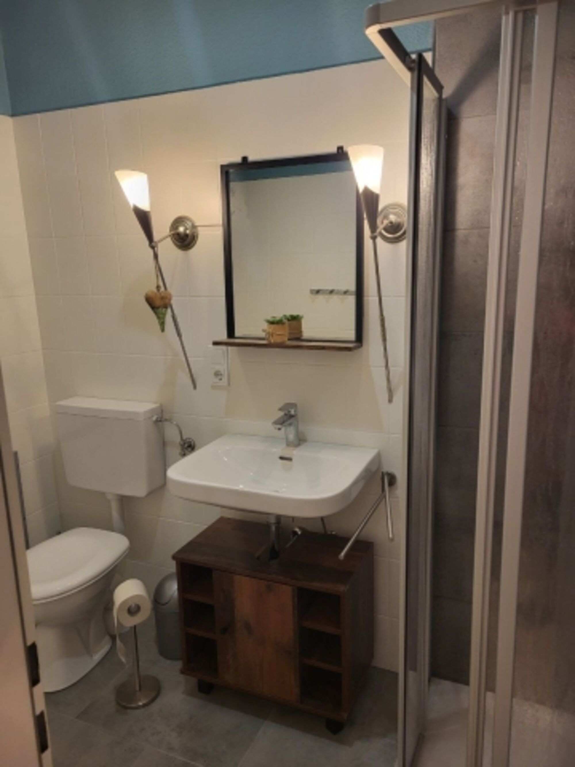 Im Erdgeschoß befindet sich das 1. Bad (neu 1/2024) mit Dusche, WC und Handwaschbecken.