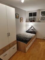 Direkt daneben ist 1 Schlafraum mit 2 Einzelbetten, 1 Doppelbett, 1 Sessel und einem 2-türigem Kleiderschrank + 1 kleiner Fernseher mit DVD-Player.