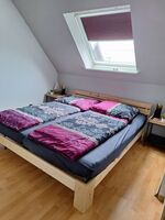 Das 1. Schlafzimmer mit 1 hohen Doppelbett, 1 Schwebetür Kleiderschrank, 1 Fernseher, 1 Sessel und 1 Kinderbett befindet sich in der ersten Etage. Hier befindet hier auch eine 2-Personen Infrarotsauna um sich z.B. nach schönen Strandspaziergängen aufzuwärmen oder einfach etwas für Ihr Wohlbefinden zu tun.
