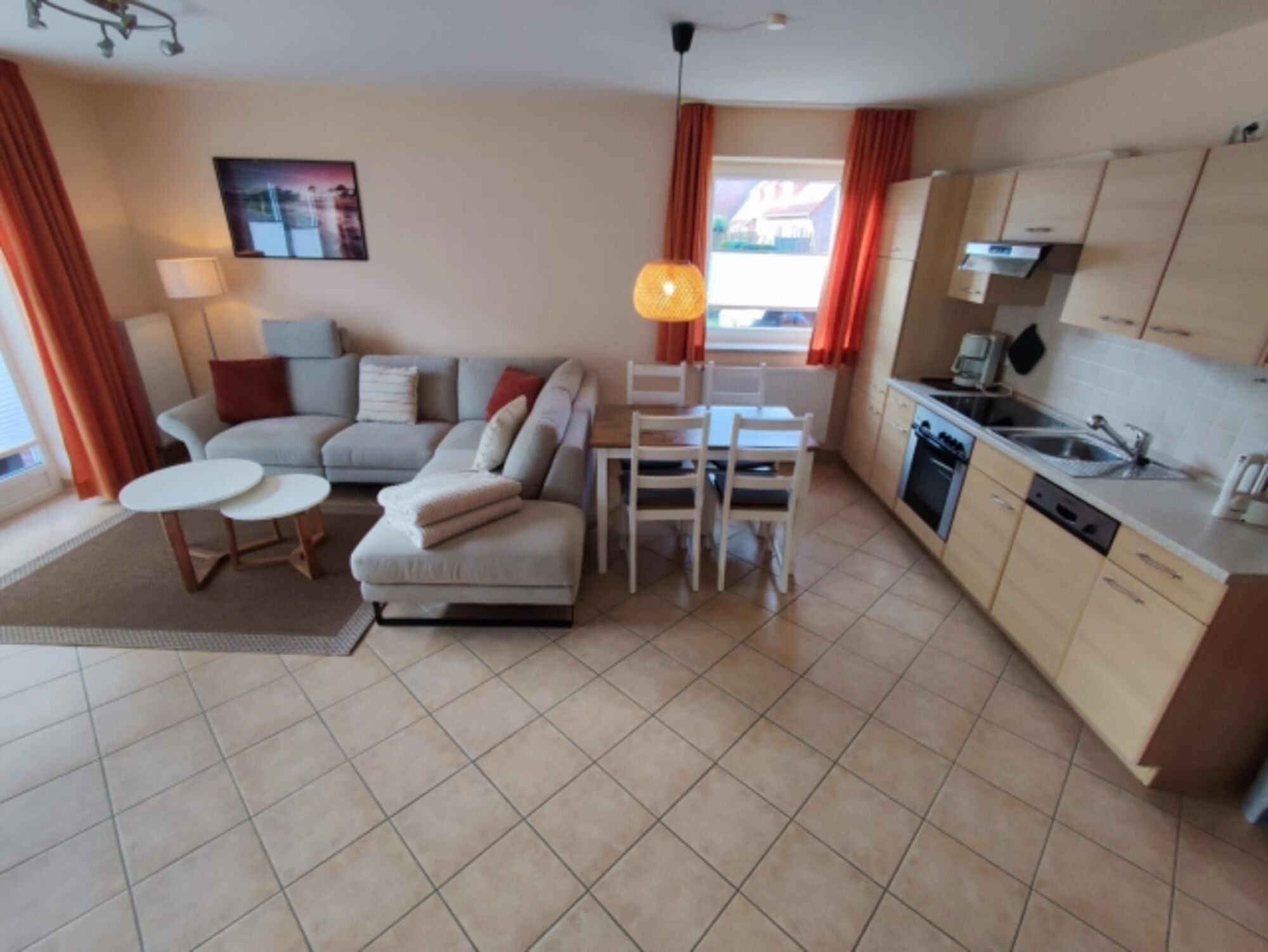 Gemütliche und voll ausgestattete offene Wohnküche, Sitzgelegenheiten direkt in der Küche bzw. im Wohnzimmer.