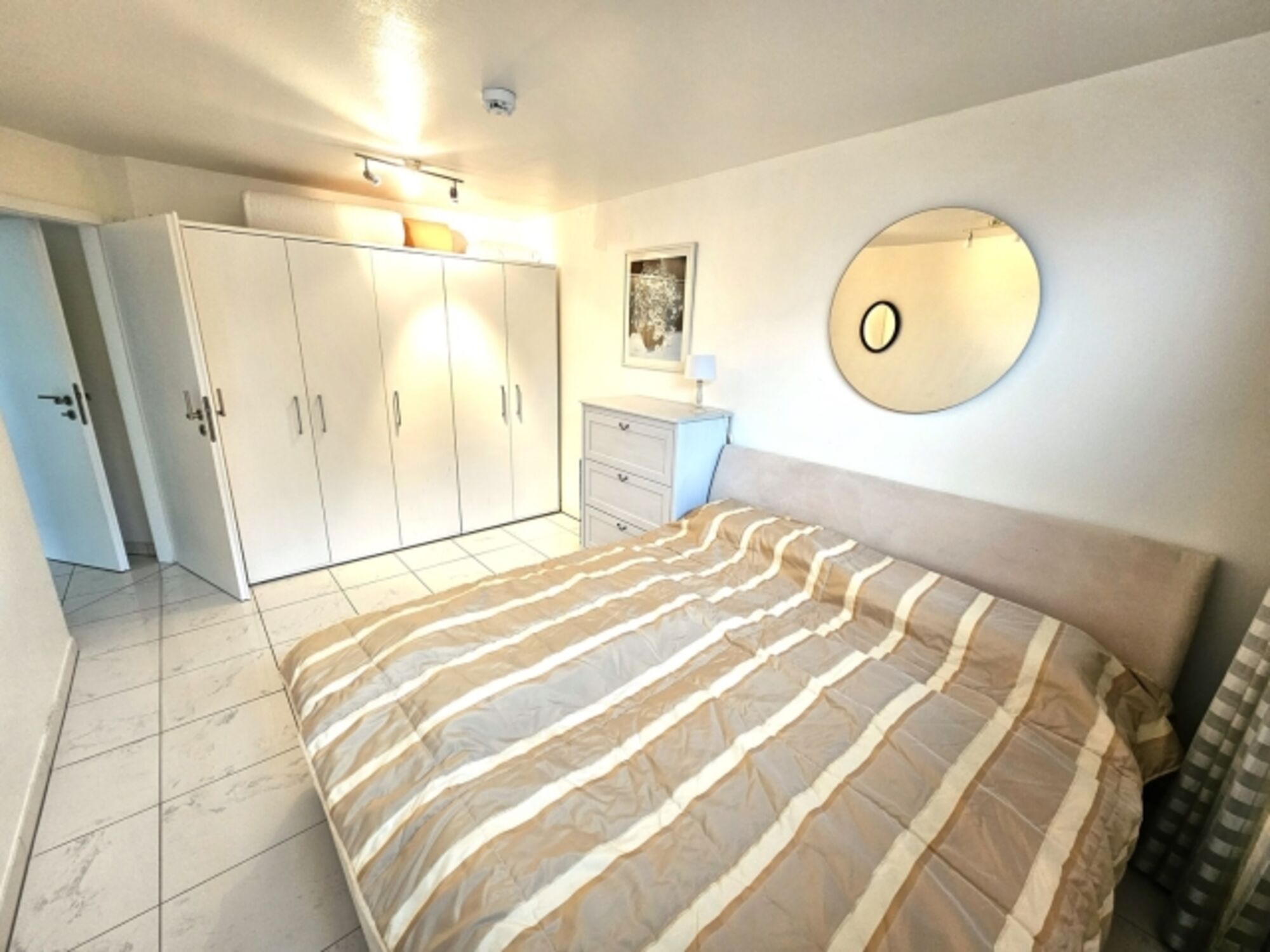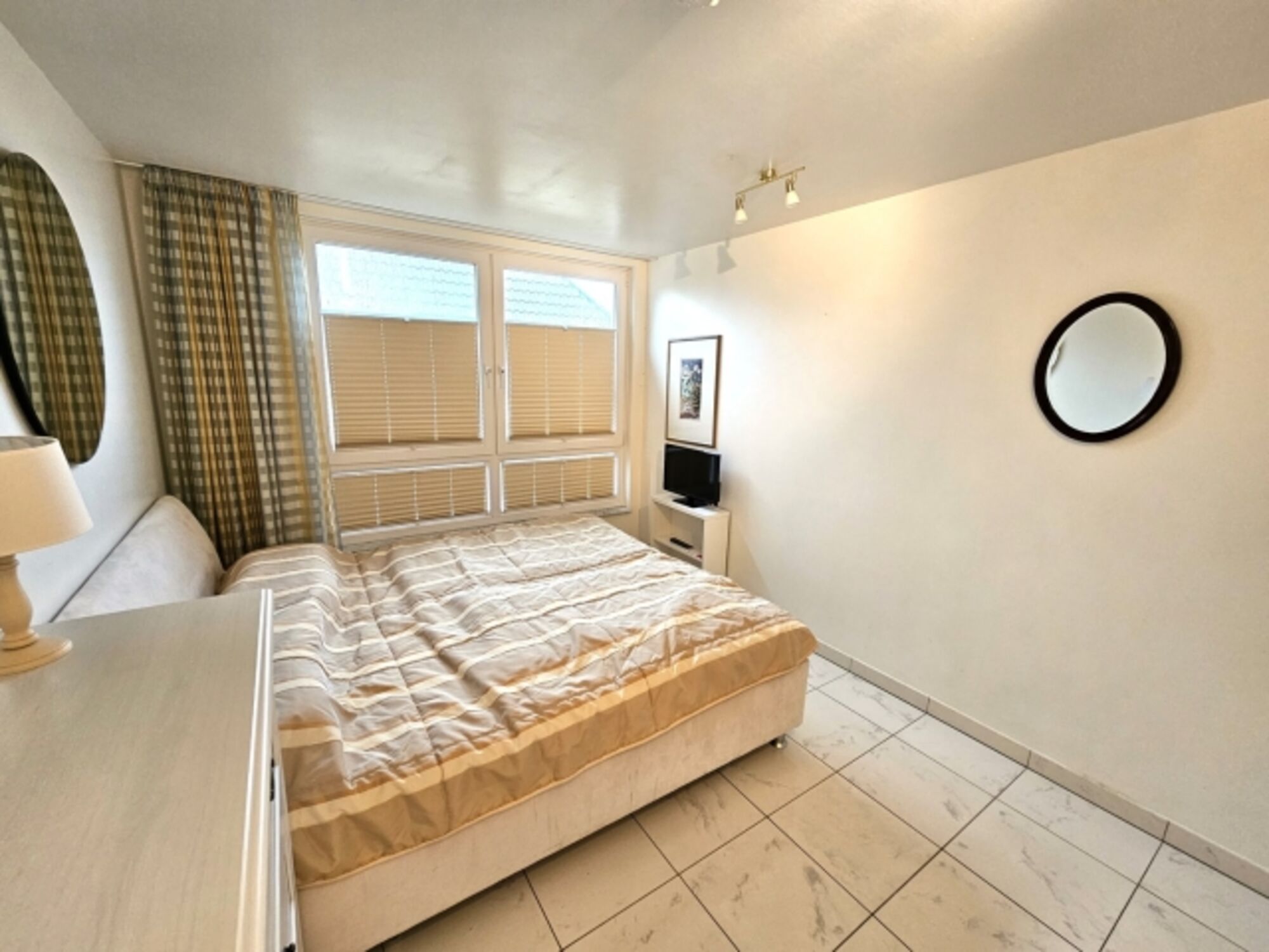 Die zwei Schlafzimmer mit großen Fenstern sind besonders hell. Im ersten Schlafzimmer mit Doppelbett und geräumigem Kleiderschrank befindet sich zusätzlich ein Fernseher.