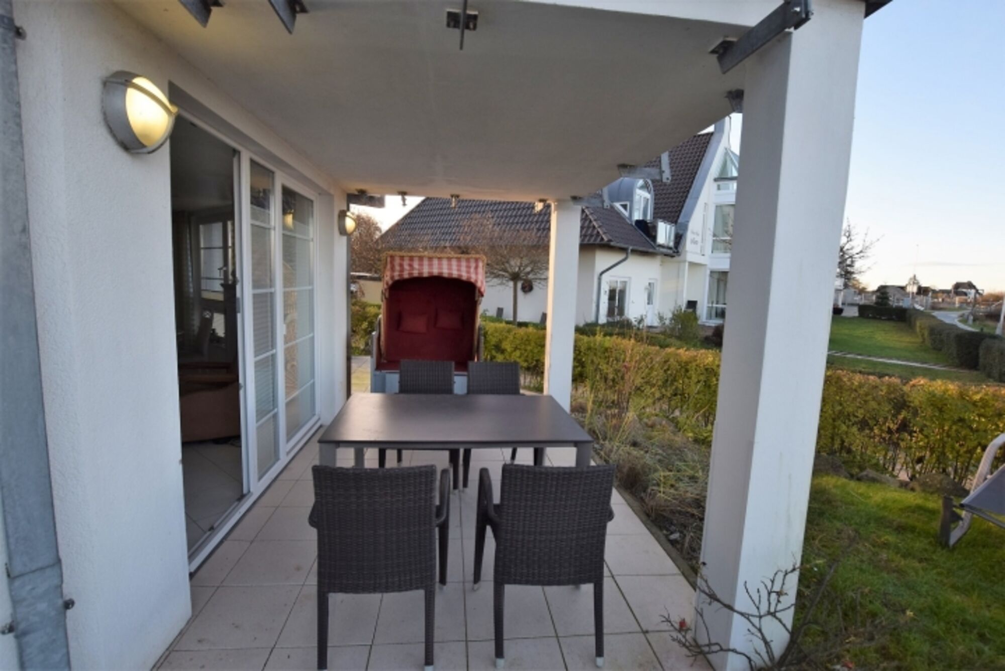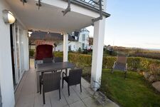 Zur Wohnung gehört eine nach Westen ausgerichtete Terrasse mit herrlichem Blick auf die Ostsee und ihre wunderschönen Sonnenuntergänge. Hier stehen Tisch und Stühle bereit um die Zeit im Freien genießen zu können.