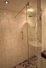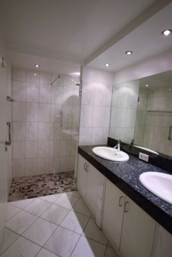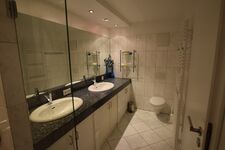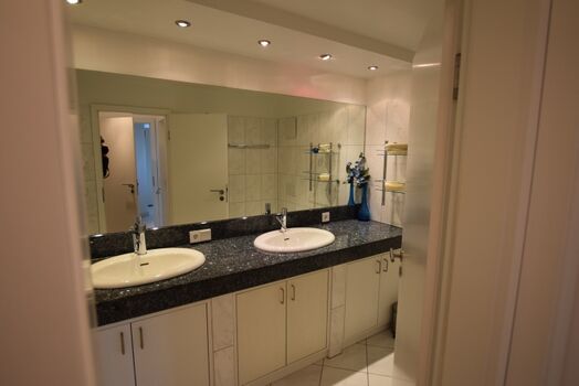 Diese Unterkunft verfügt sowohl über ein Vollbad, als auch über ein Gäste WC. Im Badezimmer sorgt der große Doppelwaschtisch gleichzeitig für reichlich Ablagefläche. Die Beleuchtung mit Deckenspots und der Handtuchhalter sorgen für modernen Komfort. Eine große Dusche ist hier vorhanden. Das Gäste WC ist im gleichen Fliesendesign gehalten und ebenso zeitgemäß ausgestattet.