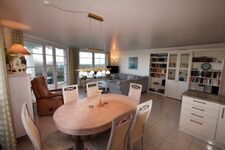 Das Wohnzimmer ist weitläufig und mit einem direkten Zugang zur schönen Terrasse, mit Strandkorb ausgestattet. Große Fenster und die doppelflüglige Terrassentür sorgen dafür, dass der Raum besonders hell und luftig erscheint. Der Blick kann hier aus allen Fenster auf den wunderschönen, weißen Strand und die tiefblaue Ostsee fallen.