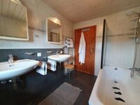 Geräumiges Badezimmer mit Duschbadewanne, zwei Waschbecken, WC, Haartrockner, Kosmetikspiegel, Bademantel. → Handtücher inklusive (bei längerem Aufenthalt wöchentlicher Wechsel). Waschbecken, Doppelwaschbecken, Spiegel, Fenster im Bad