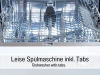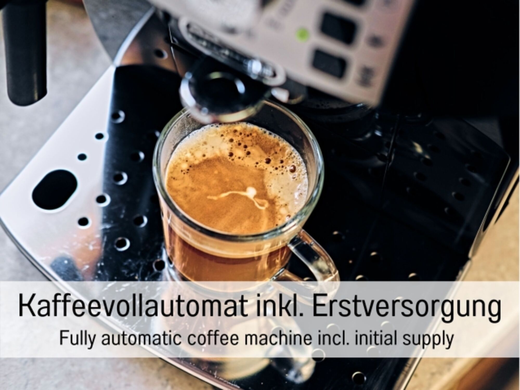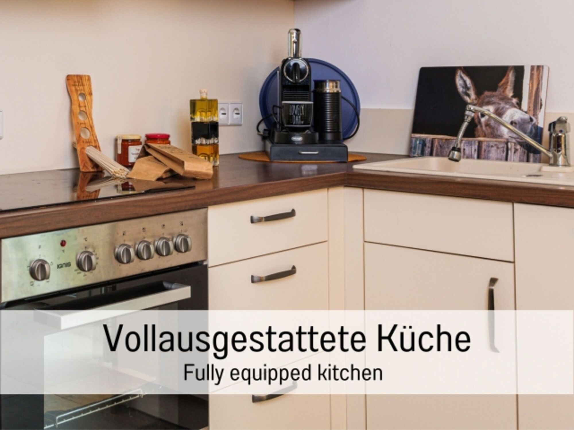 4-Platten Herd, Cerankochfeld, Dunstabzugshaube, Kühlschrank mit Gefrierfach, Kaffeevollautomat, Korkenzieher / Flaschenöffner, Gewürze (Salz, Pfeffer, Zucker), Öl / Essig, Geschirrhandtücher, Mülltüten, Essplatz in der Küche