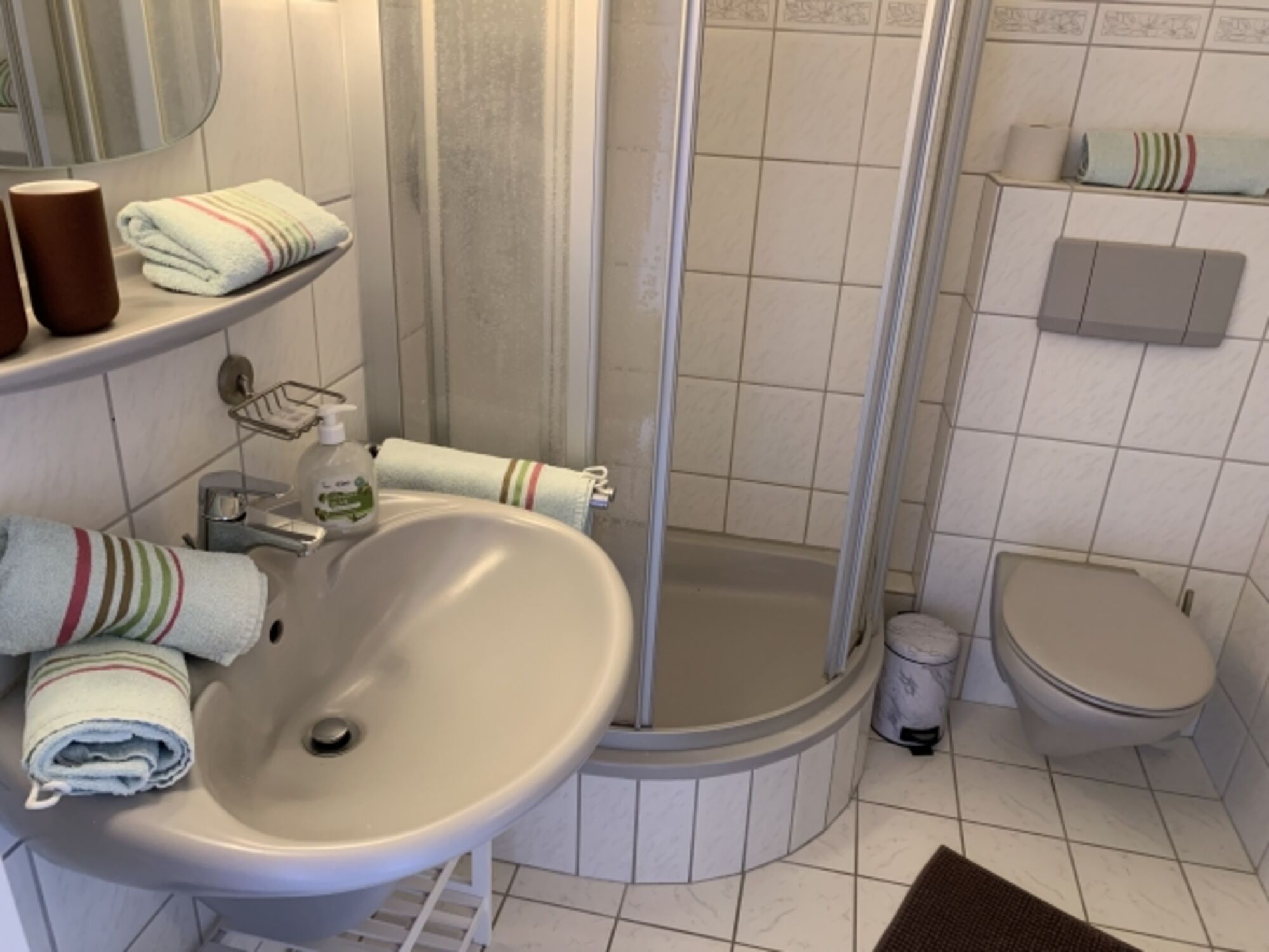 Das Duschbad bietet eine Eckdusche und Handtücher, Badetücher und Badematte gehören zur Urlaubsausstattung.