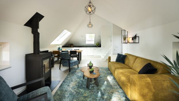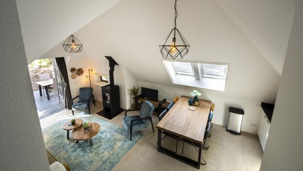 Das Ferienhaus verfügt über ein helles Wohnzimmer mit offenem Kamin wodurch Sie auch an kälteren tagen es schön warm haben im Haus. sowohl Außen als auch von Innen ist das Haus super fertiggestellt und somit ist es von allem Komfort und Annehmlichkeiten ausgestattet. Der Essbereich grenzt direkt an die offene Küche. Via den Flügeltüren betreten Sie den Garten und kommen somit auch auf die Terrasse. Auf der ebene wo Sie auch reinkommen, befinden sich zwei Schlafzimmer, ein Badezimmer mit begehbarer Dusche