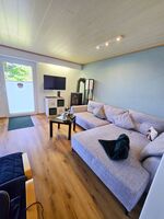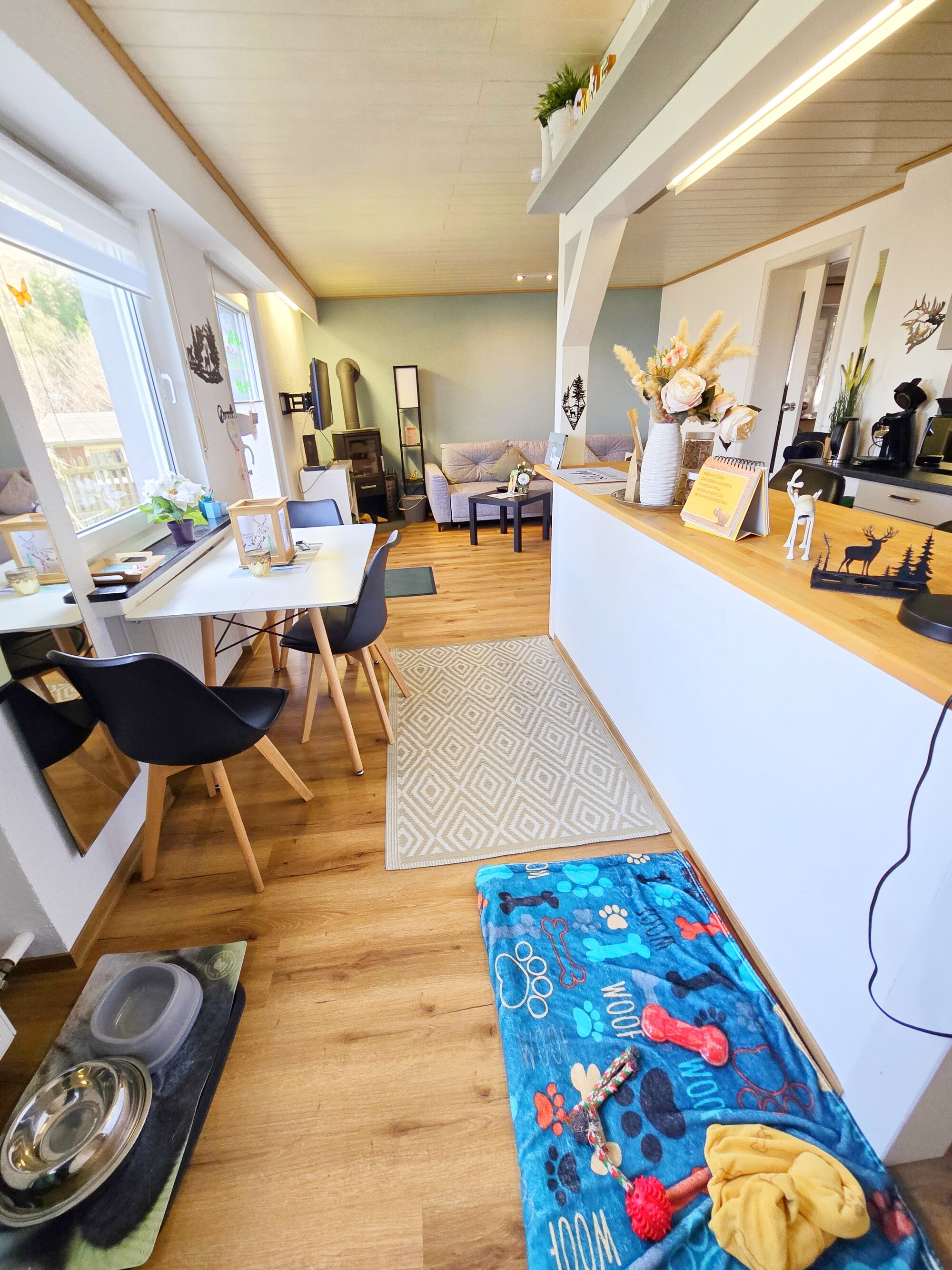 Im Inneren der Wohnung erwartet Sie eine moderne, voll ausgestattete Küche, in der Sie gemeinsam kochen können, sowie ein behaglicher Wohnbereich zum Kuscheln nach einem aktiven Tag. Das Schlafzimmer lädt mit seinem komfortablen Bett zu erholsamen Nächten ein – gern auch mit Ihrem Hund an Ihrer Seite.