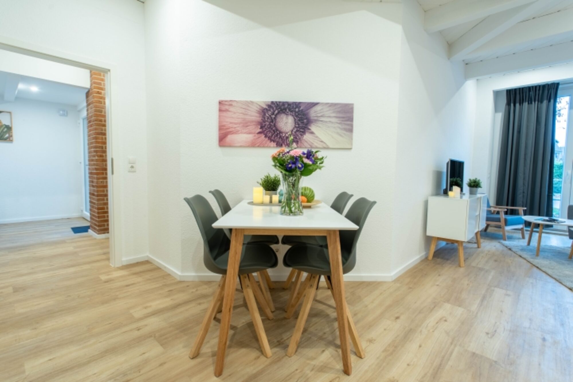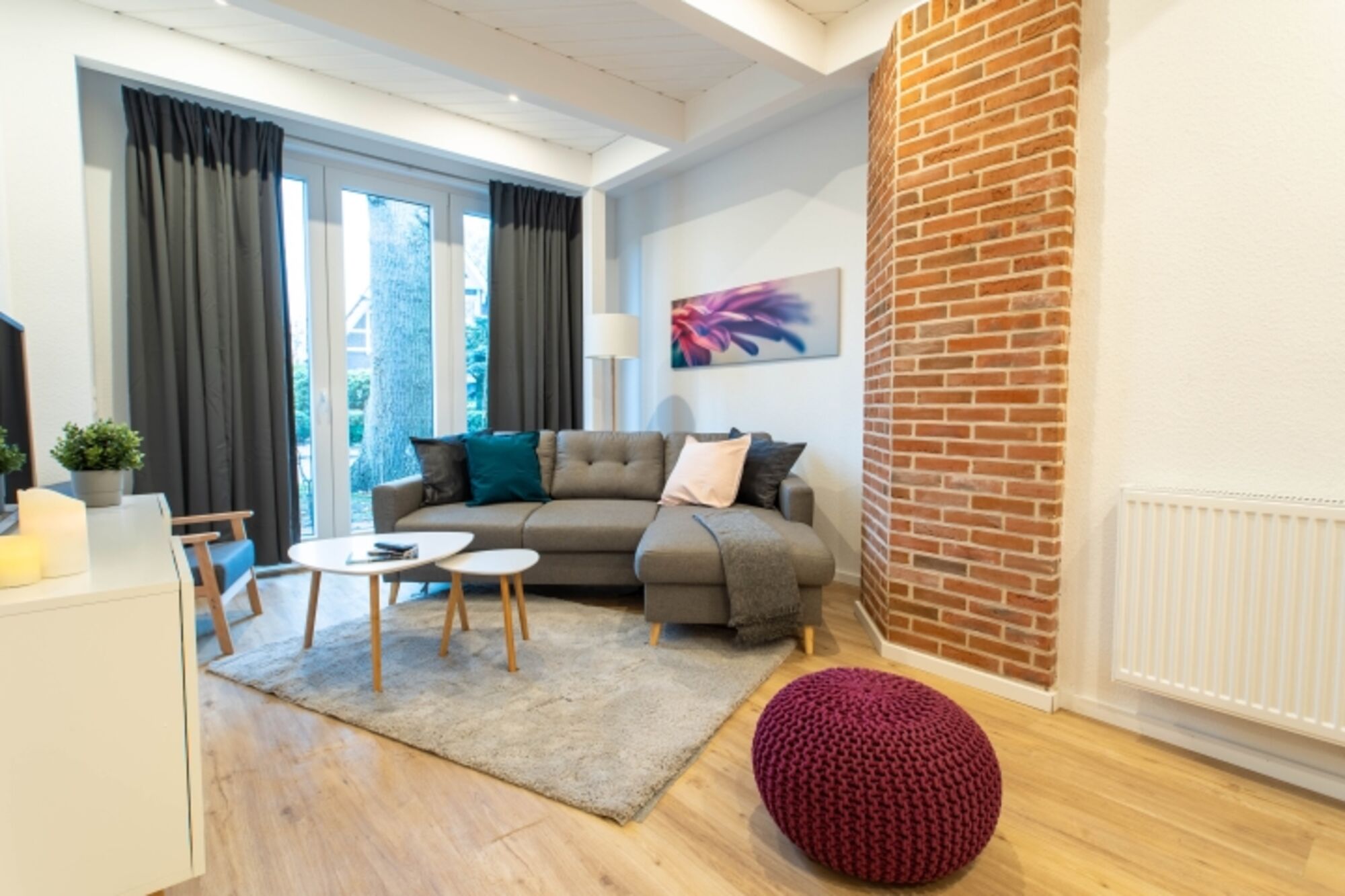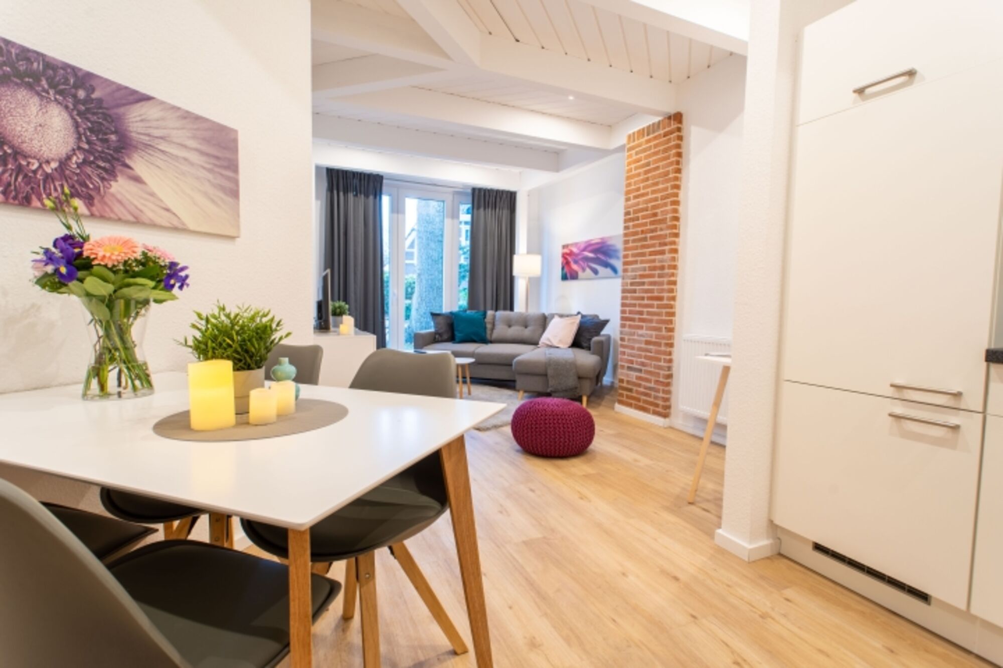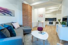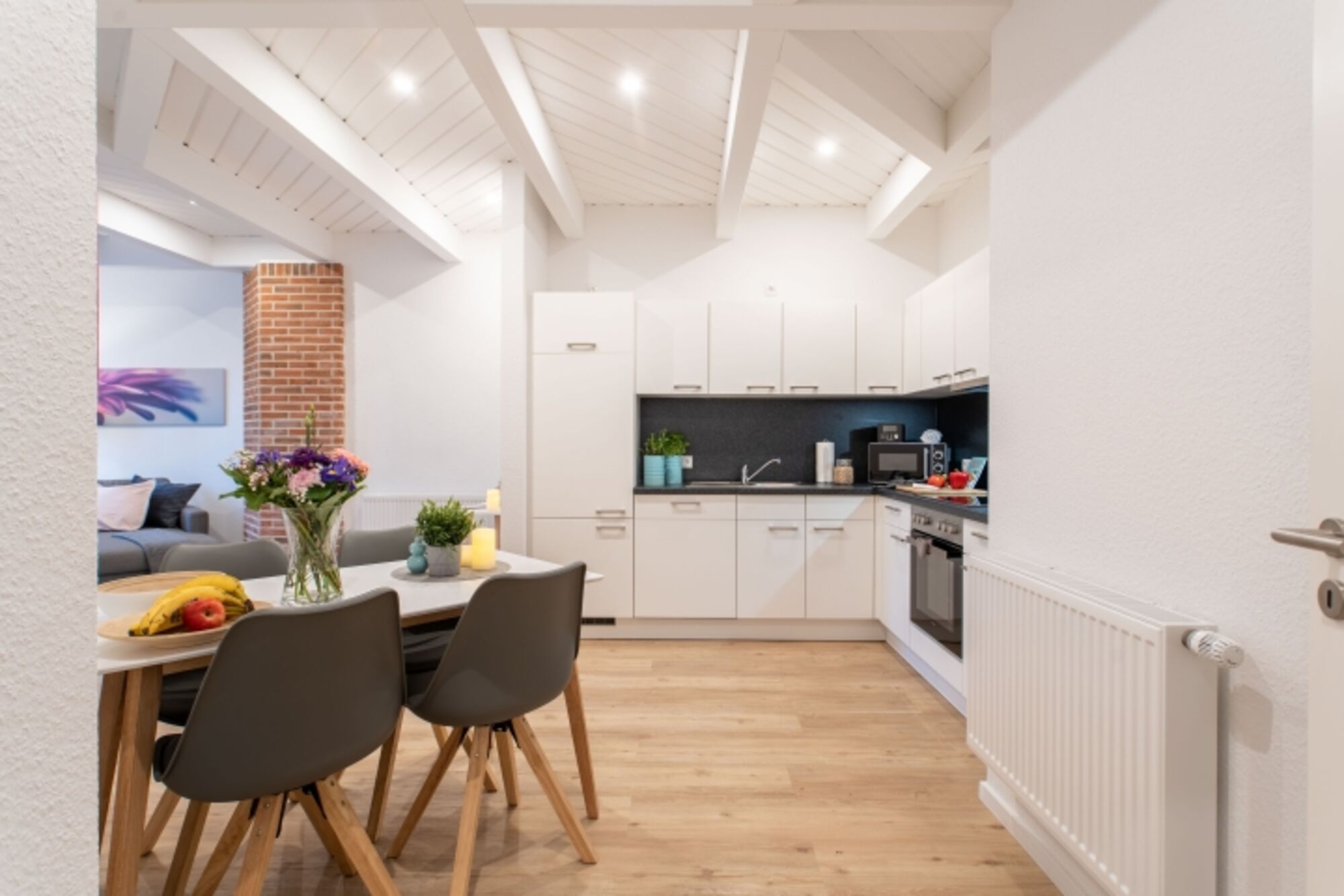 Das Besondere an diesem Apartment ist das rustikale Mauerwerk, das den Wohn- und Schlafbereich schmückt und wunderbar mit der modernen Einrichtung harmoniert. Die voll ausgestattete Küche fügt sich nahtlos in den lichtdurchfluteten und großzügigen Wohn- und Essbereich ein. Das moderne Badezimmer befindet sich gegenüber dem Schlafzimmer mit dem gemütlichen Doppel-Boxspringbett. Es bietet auch die Möglichkeit, ein Reisebett für ein Kleinkind aufzustellen. Bettwäsche sowie Handtücher liegen für Sie bereit. Dieses einzigartige Apartment bietet Platz für zwei Personen und ein Kleinkind, die hier eine wundervolle gemeinsame Zeit verbringen können.