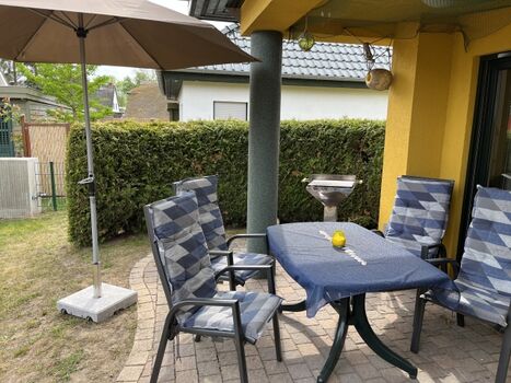 Im gemütlichen Gartenbereich befindet sich eine überdachte Terrasse mit Sitzecke, Sonnenliegen und Grill.
