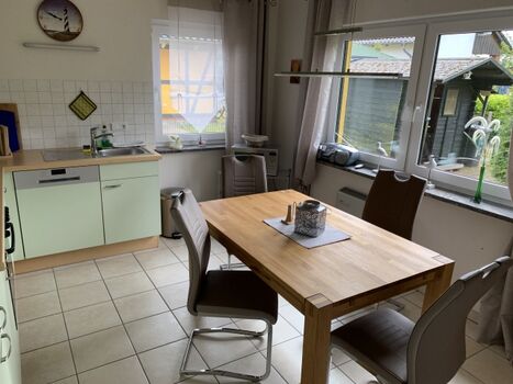 Cerankochfeld, Dunstabzugshaube, Kühlschrank mit Gefrierfach, Korkenzieher / Flaschenöffner, Gewürze (Salz, Pfeffer, Zucker), Öl / Essig, Geschirrhandtücher, Mülltüten, Essplatz in der Küche