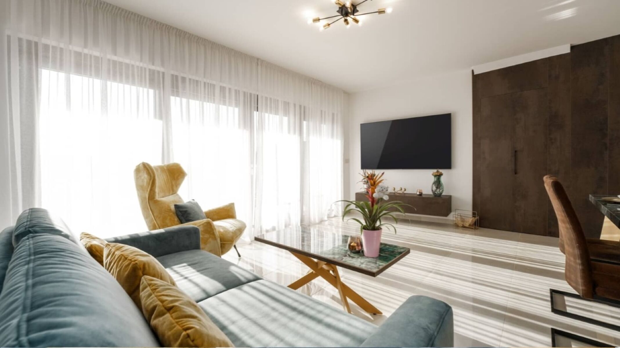 TV, SMART-TV, HDTV Flachbildschirm, 2er-Sofa, Sessel, Fliegengitter