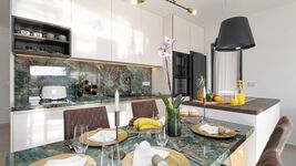 Cerankochfeld, Dunstabzugshaube, Geschirrhandtücher, Mülltüten, Essplatz in der Küche, TV in der Küche