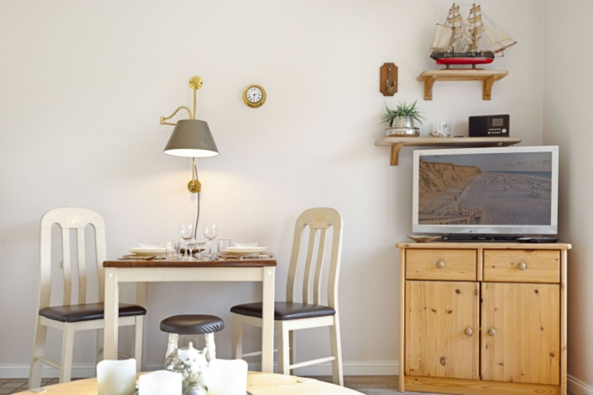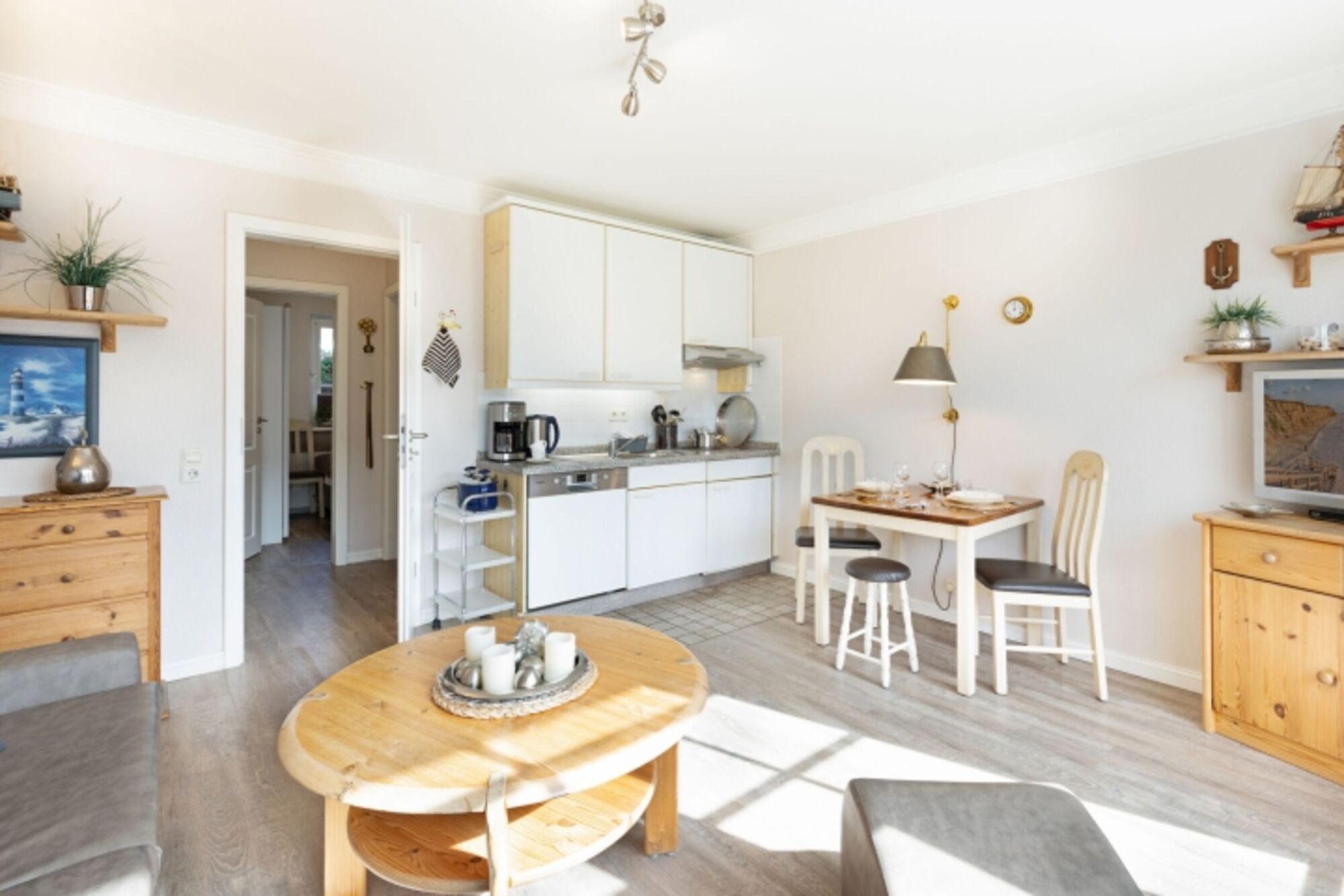 Neben dem gemütlichen Wohnzimmer mit Flachbildfernseher finden Sie eine Küche sowie einen Essbereich.