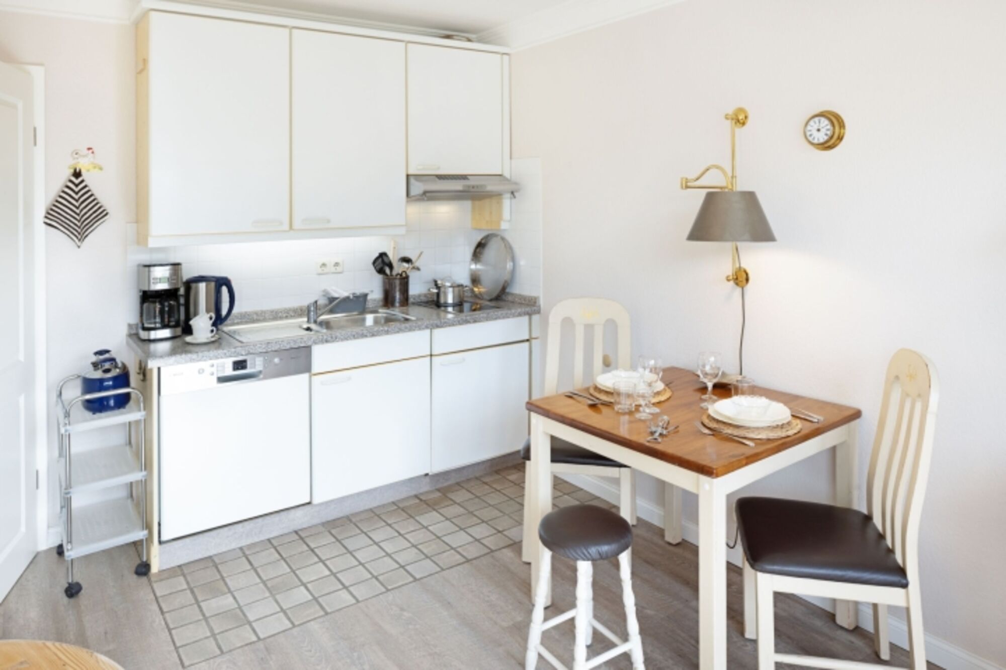 2-Platten Herd, Cerankochfeld, Dunstabzugshaube, Nespresso-Automat, Mixer, Korkenzieher / Flaschenöffner, Geschirrhandtücher, Essplatz in der Küche