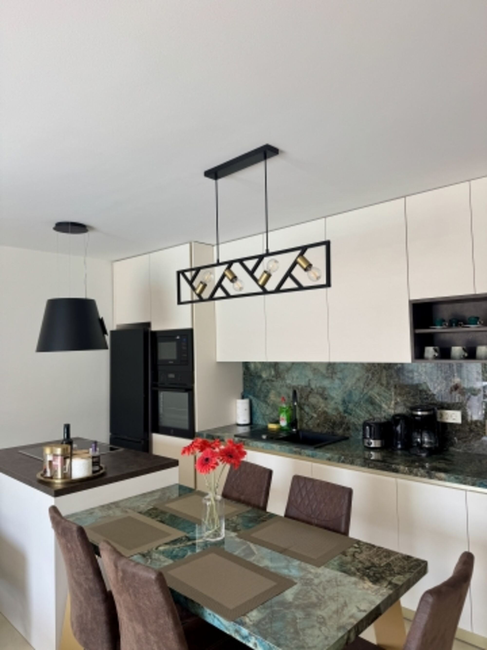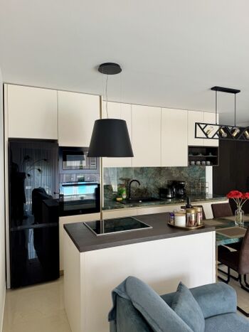 Cerankochfeld, Dunstabzugshaube, Kühlschrank mit Gefrierfach, Geschirrhandtücher, TV in der Küche