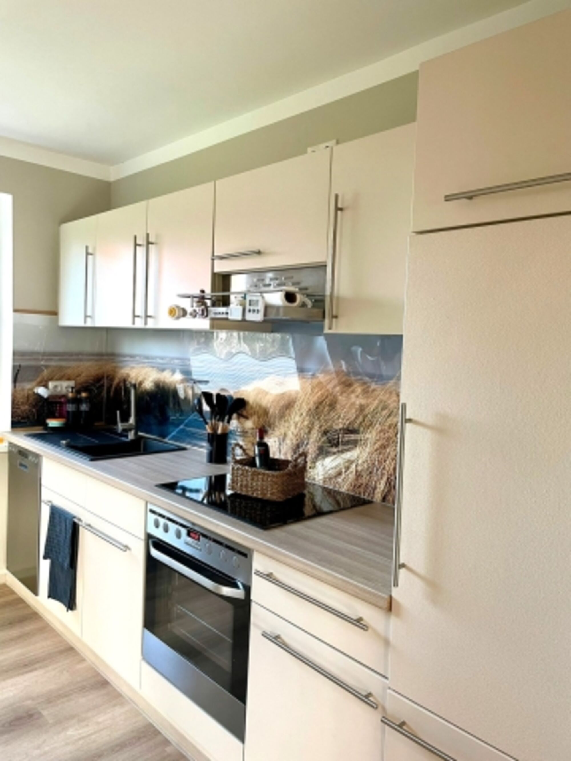 Cerankochfeld, Dunstabzugshaube, Kühlschrank mit Gefrierfach, Eierkocher, Essplatz in der Küche