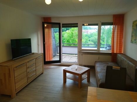 Die Wohnung befindet sich im 1. (und letzten) Stock mit Blick auf die Nahe und die Ebernburg. Sehr ruhig gelegen! Schlafzimmer mit Boxspringbett (1,80 x 2,00 m), 2 Nachtkommoden, großer Kleiderschrank, Wohnzimmer mit Schlafcouch für 2 Personen, Sidebord, TV, Esstisch mit 4 Stühlen, Küchenzeile mit Ceranfeld, Dunstabzugshaube, Backofen, Kühlschrank mit Gefrierfach, Spülmaschine, Kaffeemaschine, Wasserkocher, Toaster, Eierkocher, Bad mit Badewanne mit Duschvorhang, WC und Waschbecken, Balkon mit Tisch und 4 Stühlen.