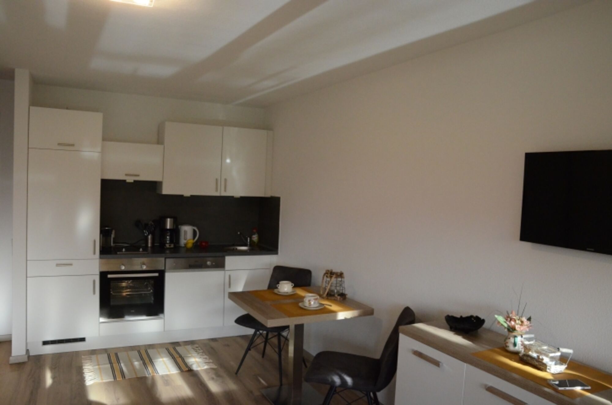 2-Platten Herd, Dunstabzugshaube, Kühlschrank mit Gefrierfach, Nespresso-Automat, Mixer, Korkenzieher / Flaschenöffner, Geschirrhandtücher, Mülltüten