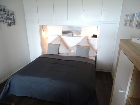 Doppelbett 1,80 x 2,00m, Kommode, Leselampe am Bett, Schrankbett