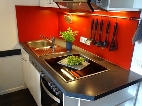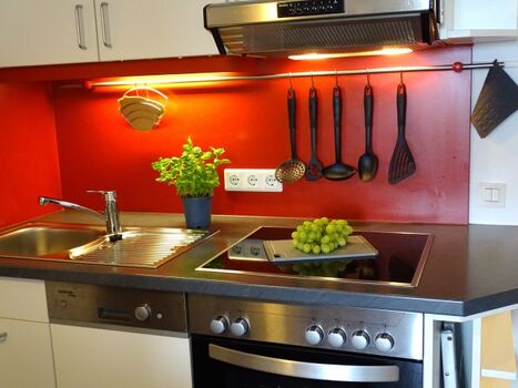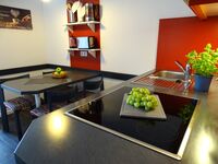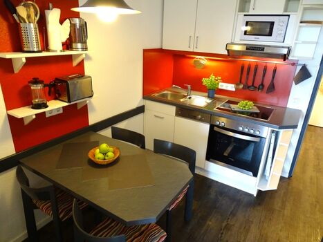 Cerankochfeld, Dunstabzugshaube, Kühlschrank mit Gefrierfach, Senseo-Kaffeeautomat, Eierkocher, Mixer, Essplatz in der Küche