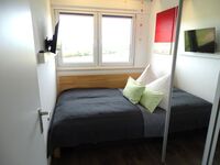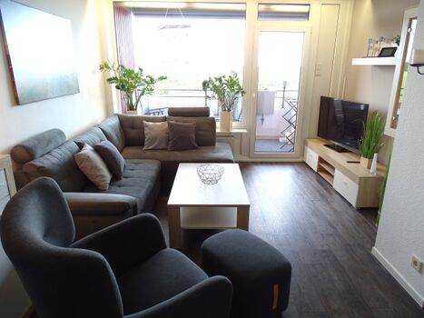 Die Wohnung besticht durch einen lichtdurchfluteten, offenen Wohn- und Schlafbereich. Ausgestattet ist Ihr Urlaubsdomizil mit einem Doppelbett (180x200), Kleiderschrank, sowie einem Ecksofa , 1 Sessel, einem Flachbildfernseher und direktem Zugang auf den möblierten Balkon mit Blick über die Felder und seitlichem Meerblick. Die offene Küche ist z. B. mit einem 4-Platten-Cerankochfeld, einem Backofen und einer Geschirrspülmaschine voll ausgestattet. Für den Kaffee am Morgen steht Ihnen eine Senseo Duo-Kaffeemaschine zur Verfügung. Der Esstisch lädt zu einem geselligen Essen mit der Familie ein. Im separaten Schlafzimmer erwartet Sie ein Doppelbett ( 140x200 ), sowie ein Schrank und ein weiterer Flachbildfernseher. Alle Schlafräume lassen sich angenehm verdunkeln. Das Badezimmer ist mit einer Badewanne ausgestattet. Der WLAN-Anschluss ist selbstverständlich inklusive.