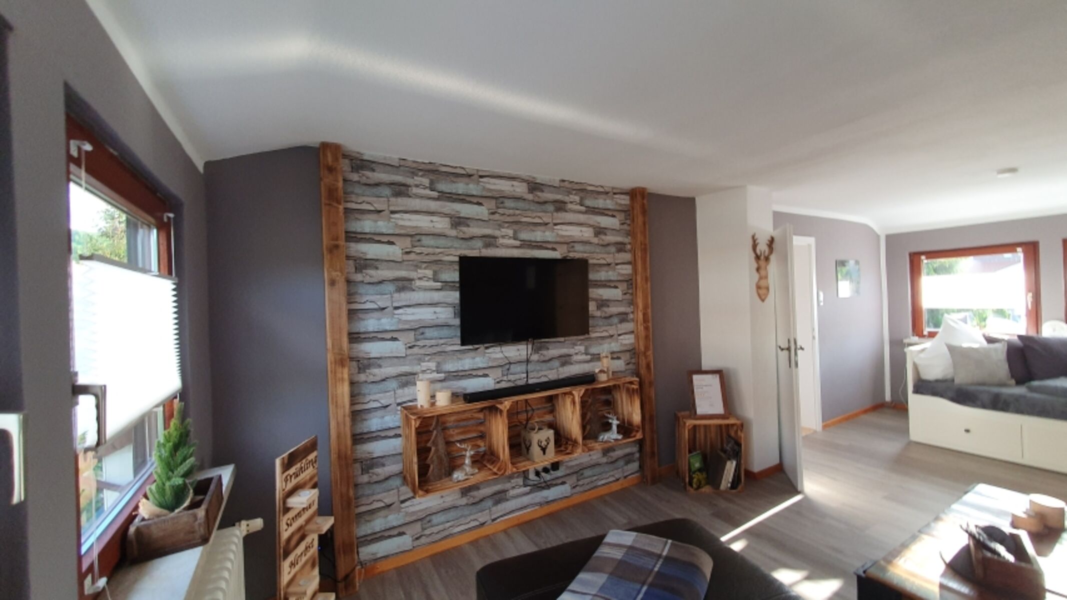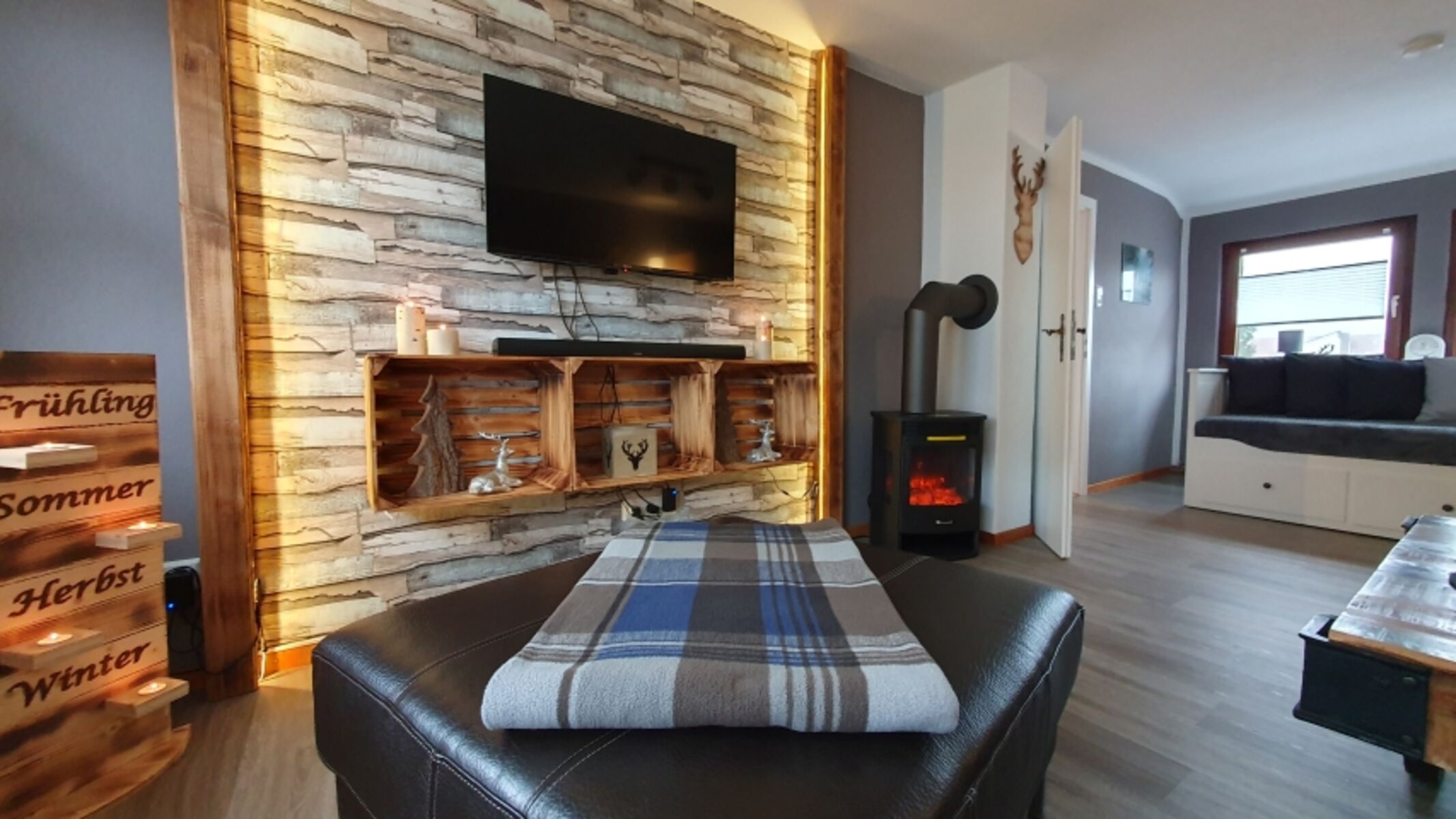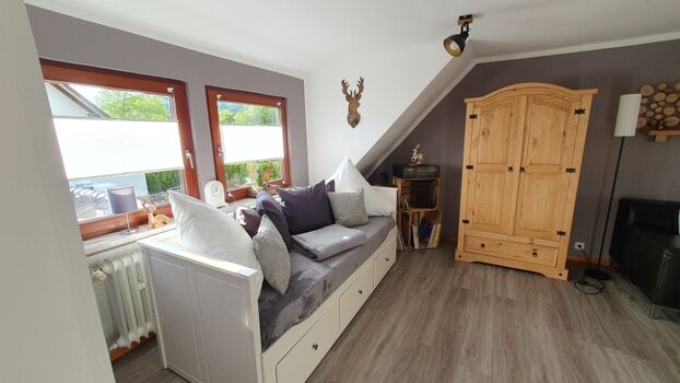 Großes, gemütliches Wohnzimmer mit ausziehbarem Tagesbett (auf Doppelbettgröße – ideal für bis zu 2 zusätzliche Personen)